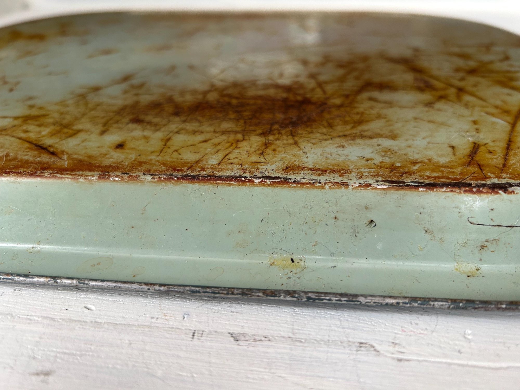 This tray is in used vintage condition, the metal shows wear and tear due to age, a number of rust areas are showing. This all gives the tray a true vintage look. Please see all pictures.