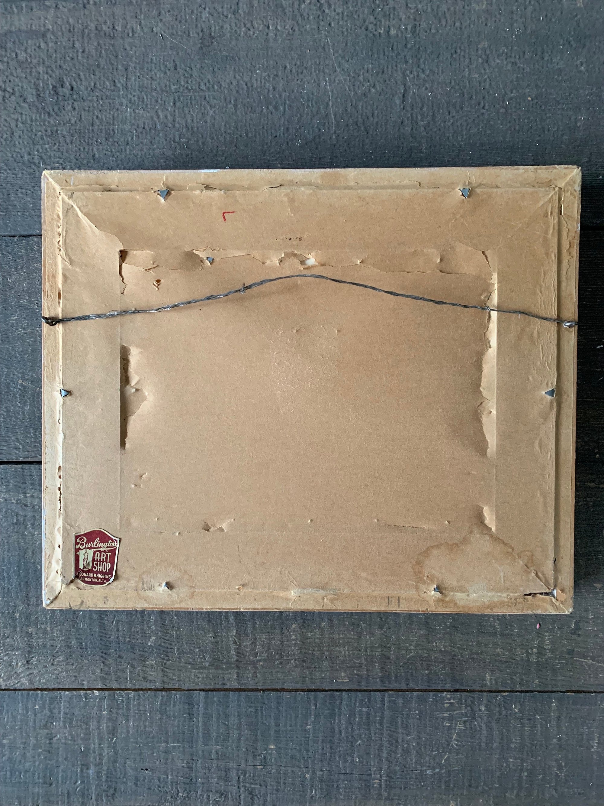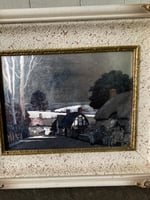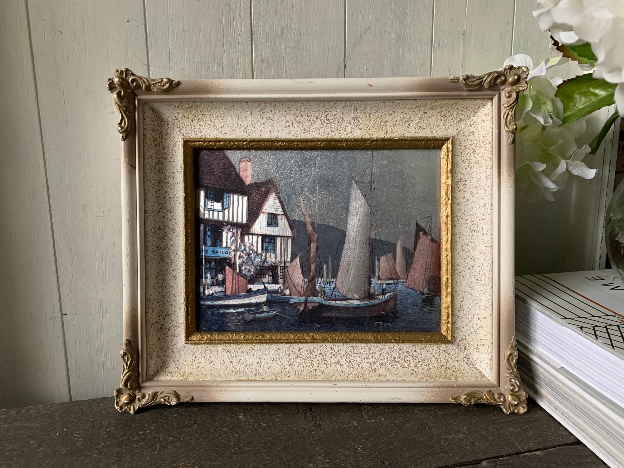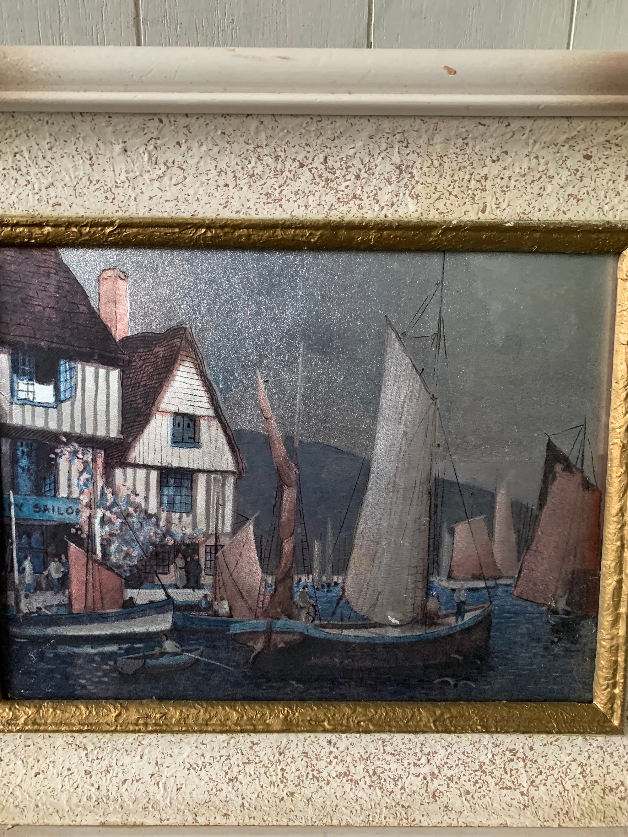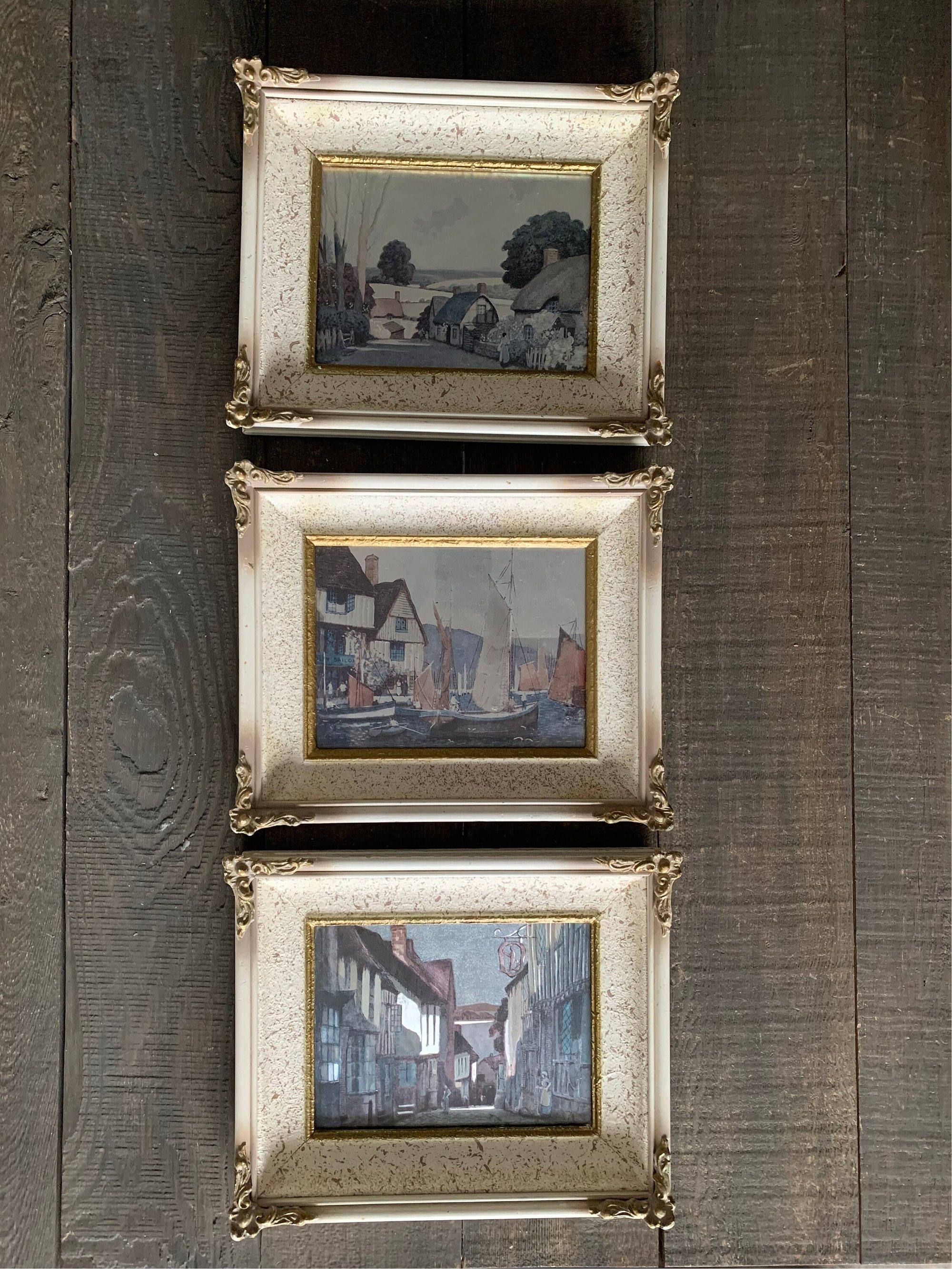 The backings are showing their age on all the pics however they still have the original wire. The color on the frame is between cream and white and there is gold/bronze around the corners. The pictures themselves are all done in what appears to be metallic printing.