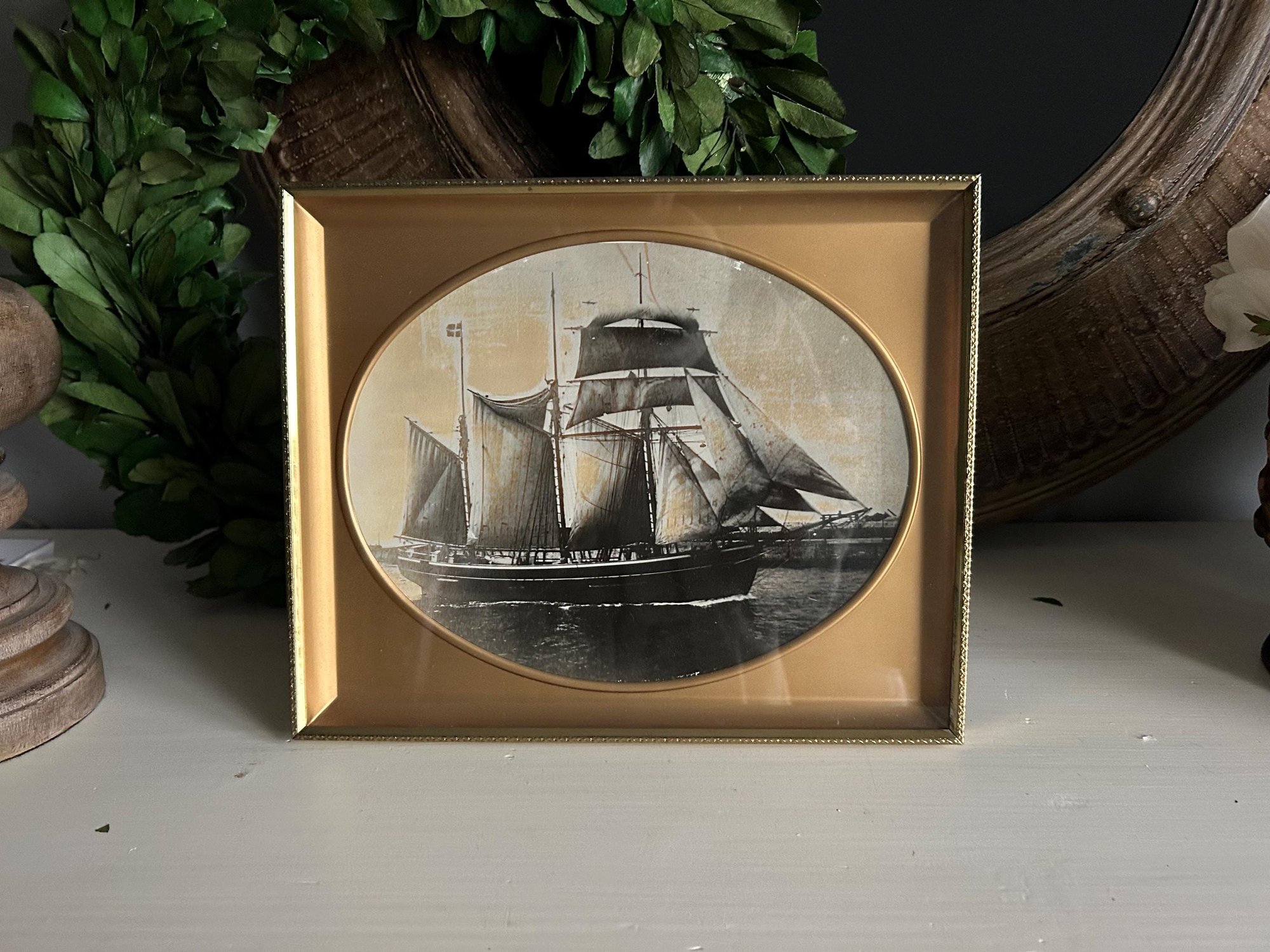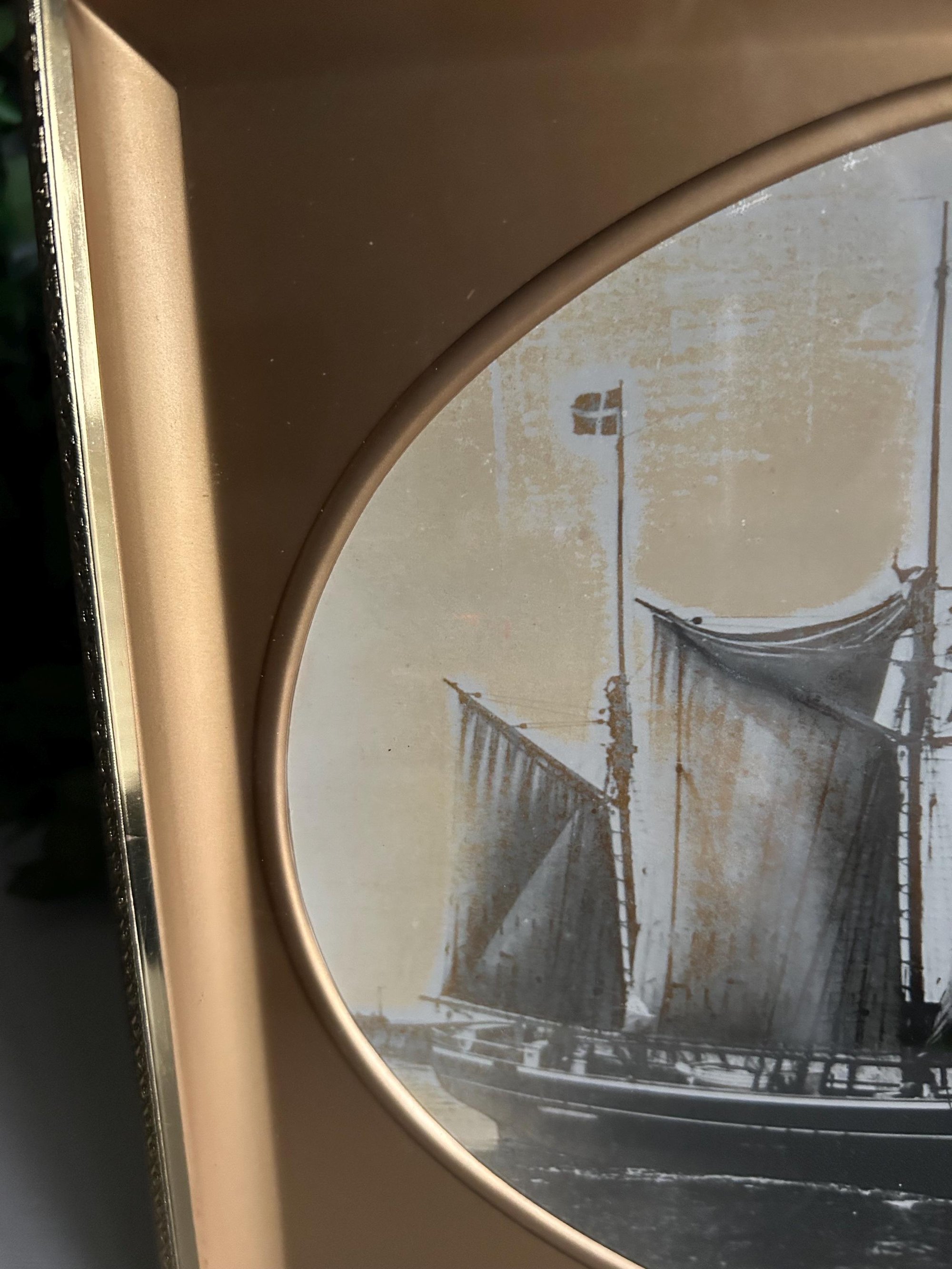 This vintage metal frame and print are in great condition. The frame is setup as a shadowbox, it has almost 1 inch depth between the glass and the picture itself. The frame and the stand are very sturdy and in great vintage shape. This does have hooks so it is tabletop and wall hanging.