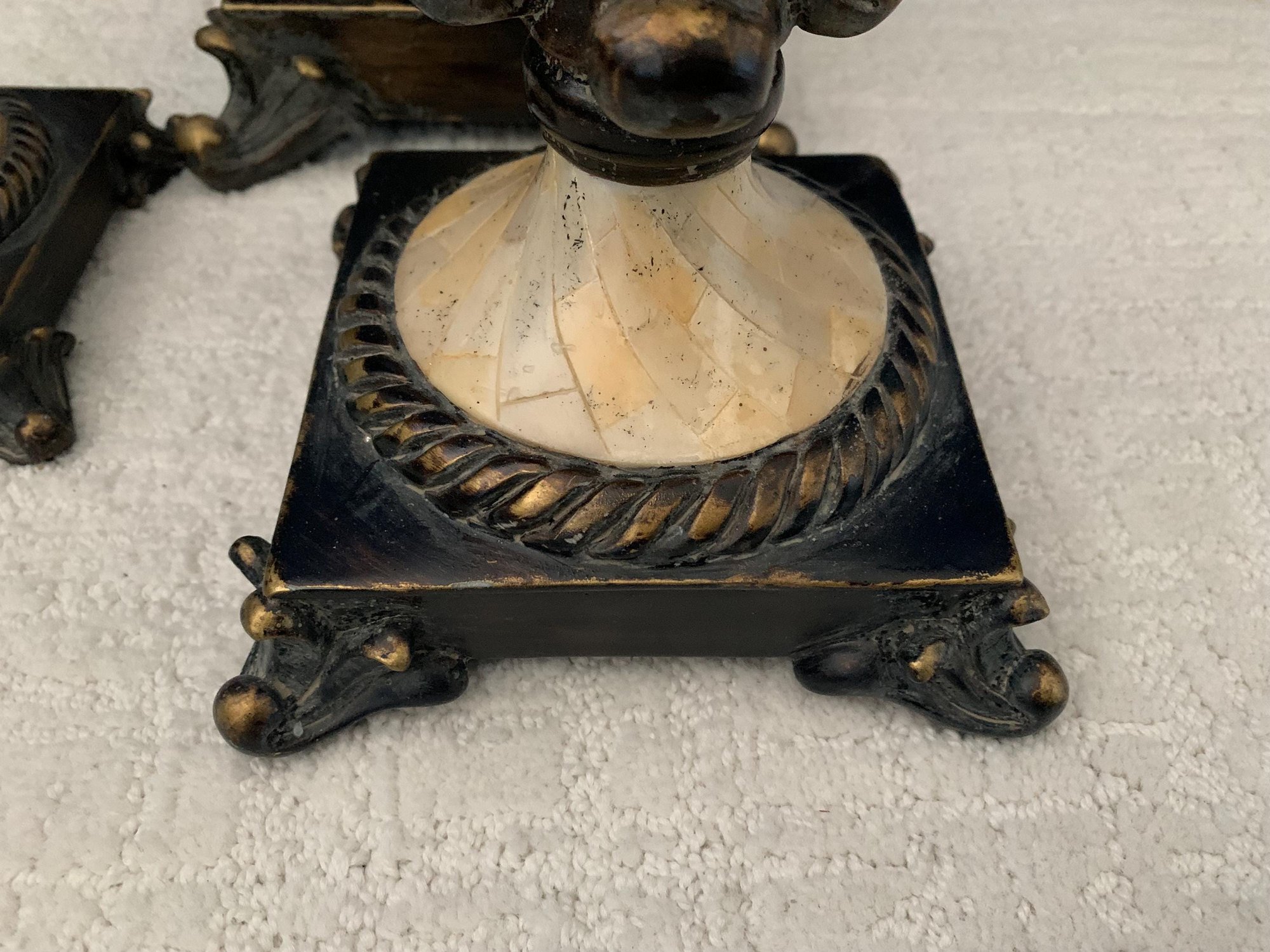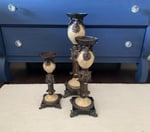This lovely resin pilar set of candle holders can add a touch of elegance to any room. The ornate design features carved design with four feet leaf shape and in gold and bronze with a faux marble look in the middle, and square shape at the bottom. Hand painted crafted from resin these candle holders are carved and have a old world look to them