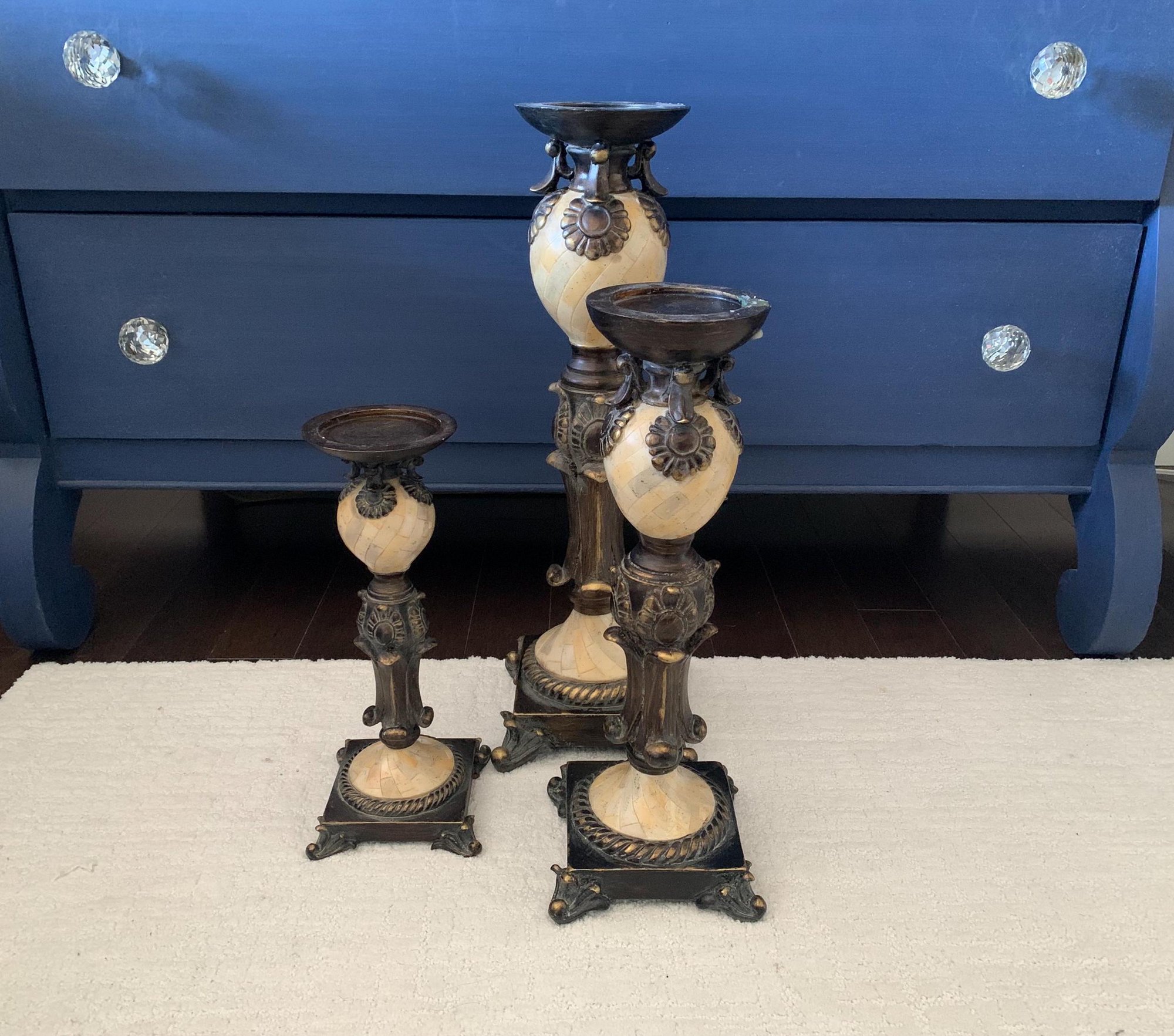 Ornate Resin Candleholder Set: Gold and Bronze Pillar Trio