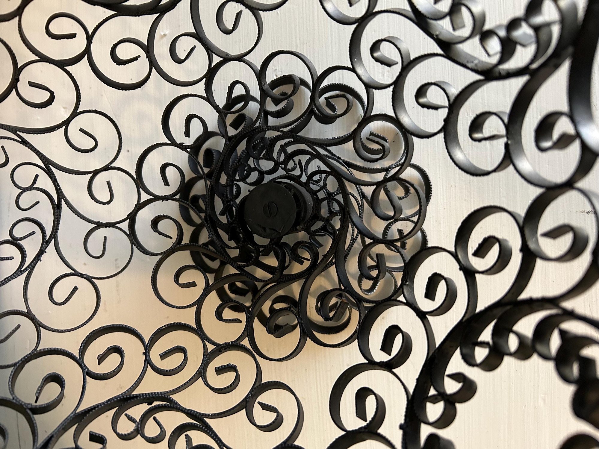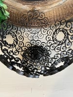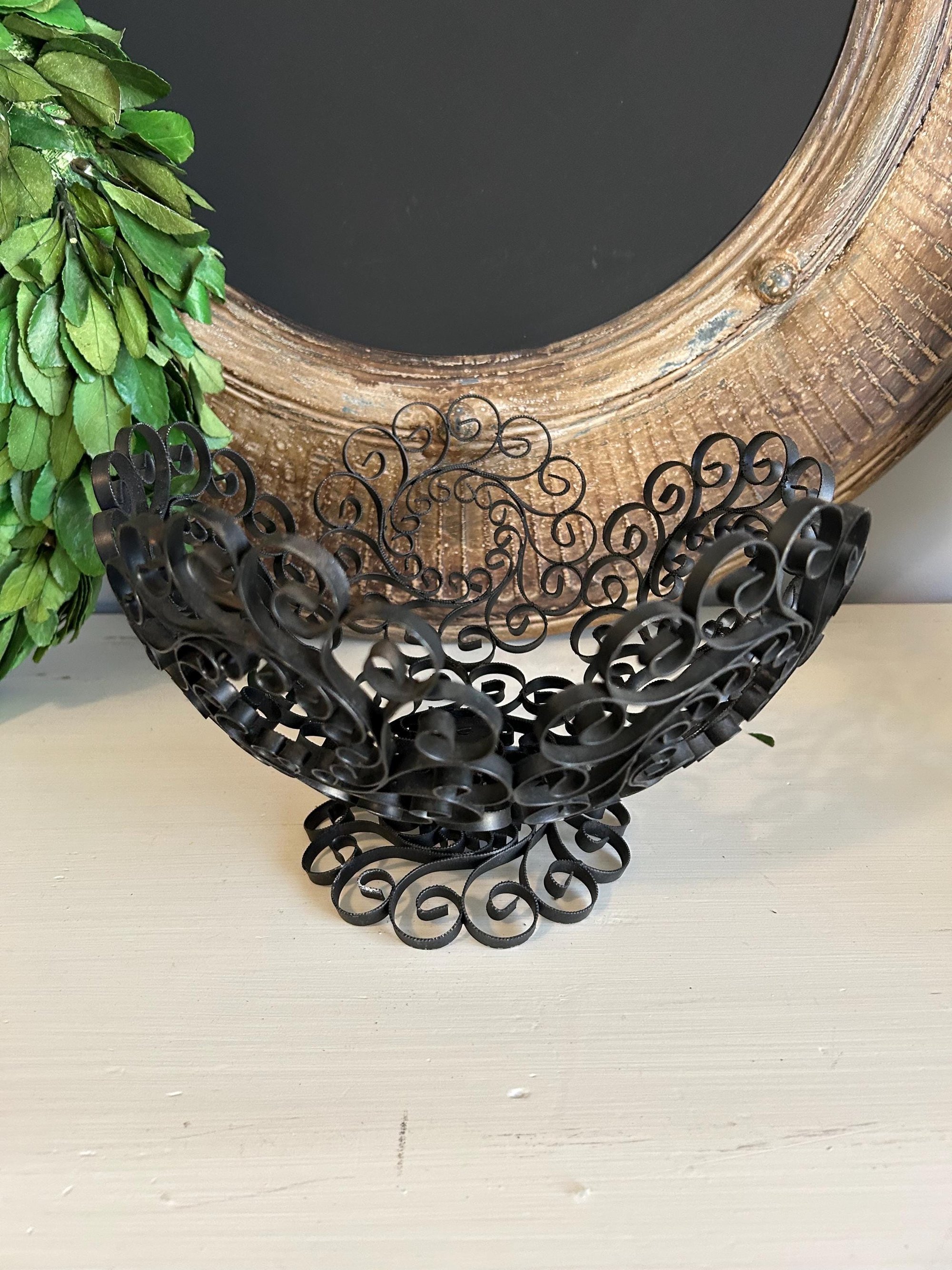 This wire bowl on a stand is quite unique, the scroll work is very detailed. It is perfect for a fruit bowl or centerpiece. It’s in good condition.