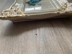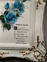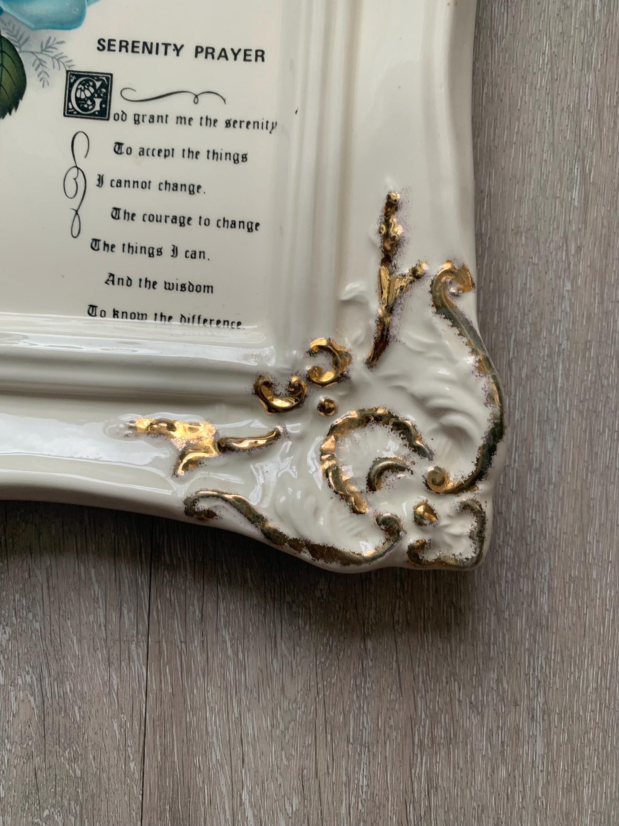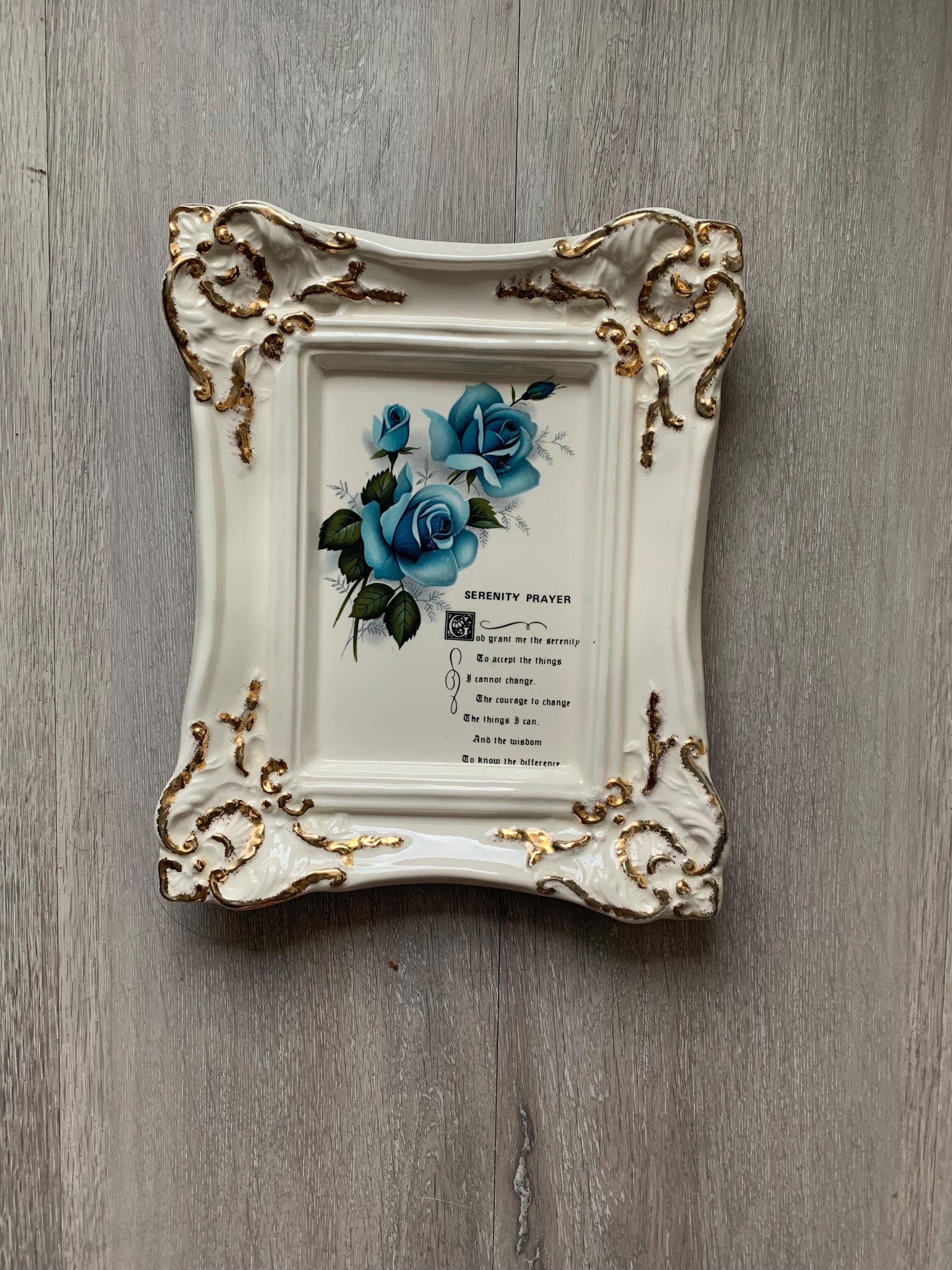 This Serenity Prayer inspirational message wall decor with hanger on back is in great vintge condition. Gold scalloped trim with Serenity Prayer and beutiful blue flowers, no cracks or chips anywhere