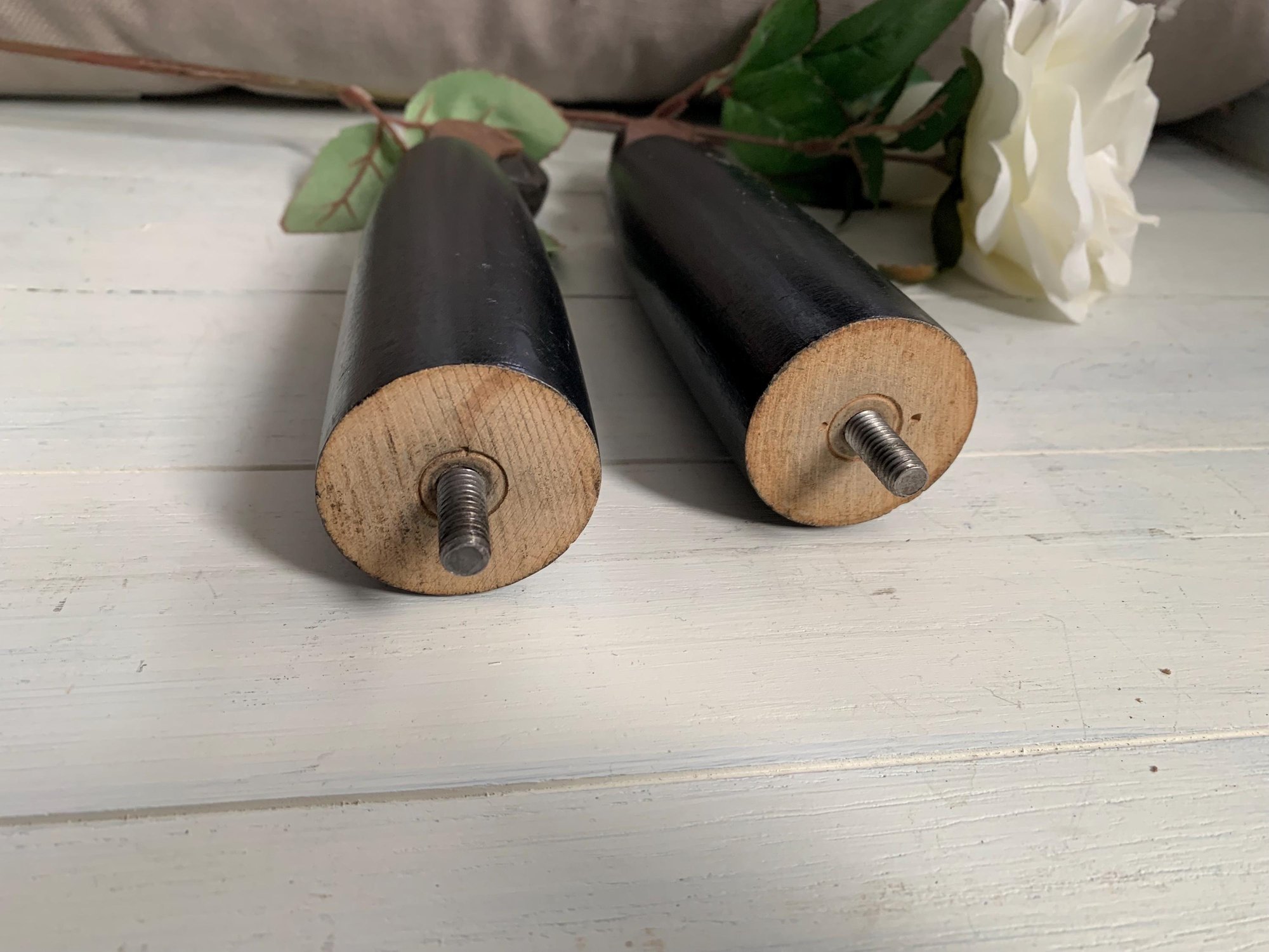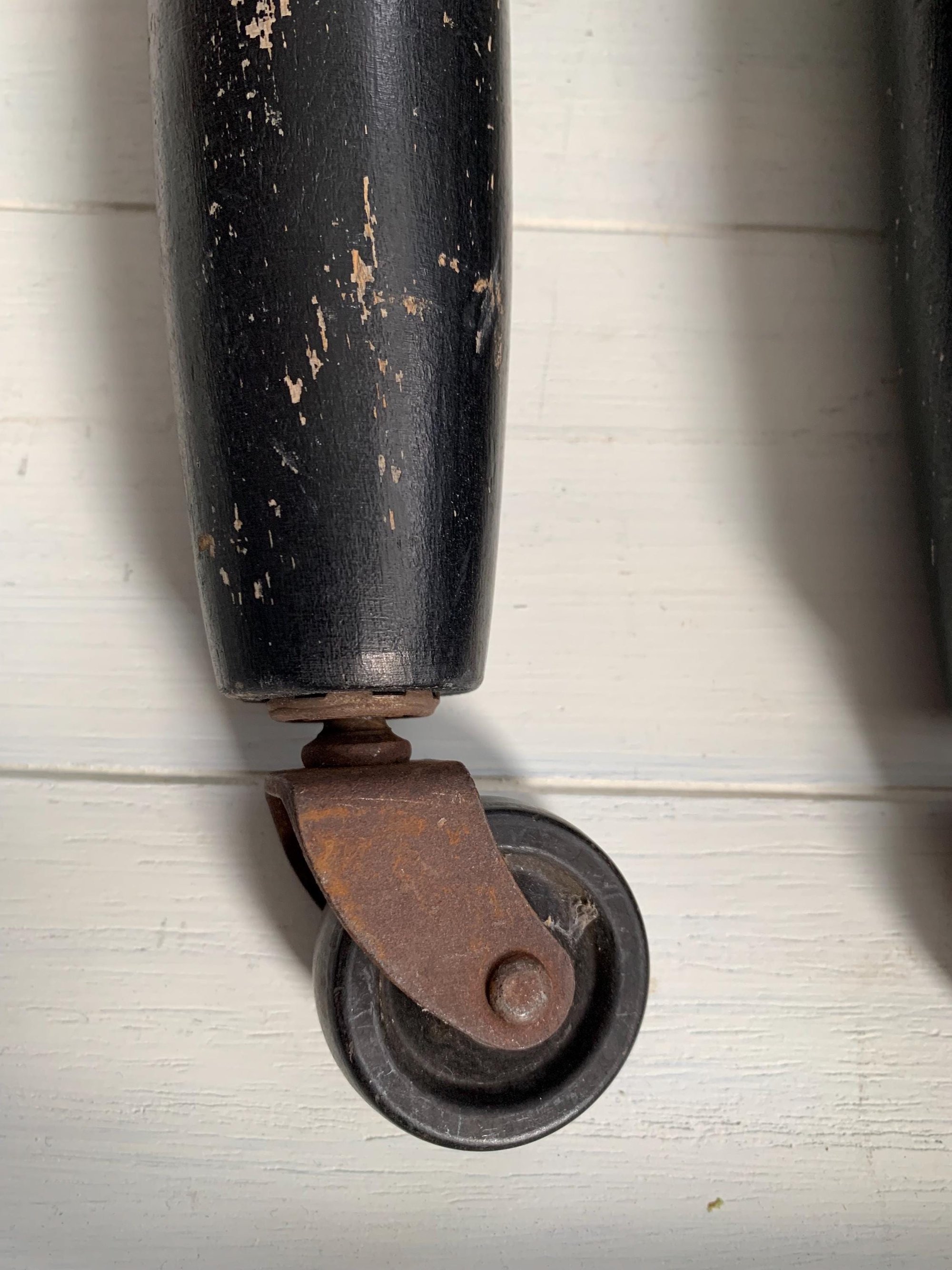 This listing is for a set of 2 vintage table legs. The wooden legs are in good condition, sturdy and strong. The metal is rusted, but the wheels do turn without a problem
