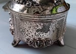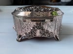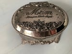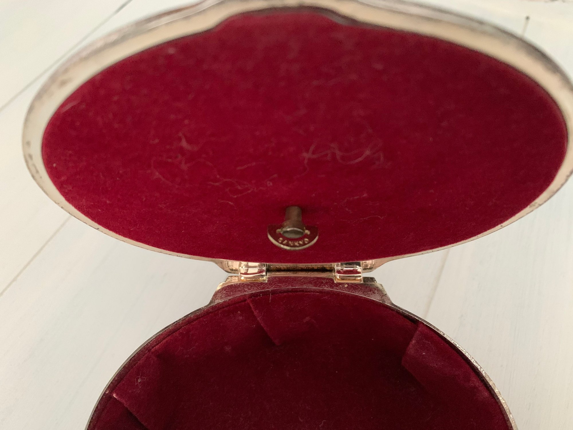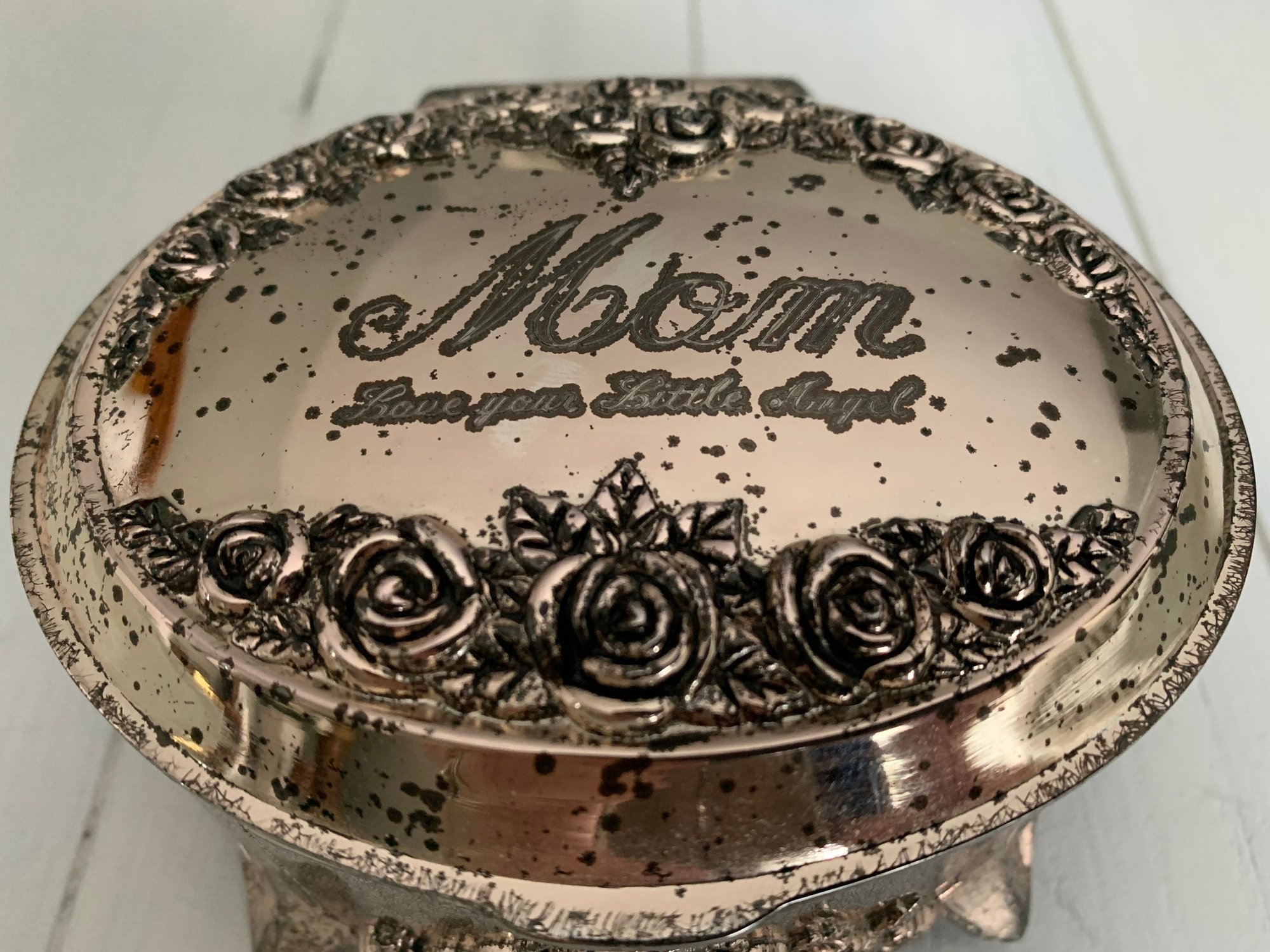 This silver trinket/music box is in excellent shape. On top is engraving stating 'Mom From Your Little Angel'. The hinge works great and the key to start music works. I have only tested it once, but music does come out at a somewhat slow pace but is quite audible. The velvet inside and bottom are both in excellent condition. Pictures were taken on 2 different days so lighting was different and shows in pictures.