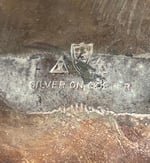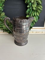 A vintage silver on copper pitcher with ornate handle. The pouring spout is wide. It has a bulbous body with a footed base. Nice weight for its size. In very good vintage condition with lots of darkened black patina inside and out but no dents that I can see. There is engraving on the bottom but it is hard to read. It would polish up nicely if desired for table use. Please zoom images.
