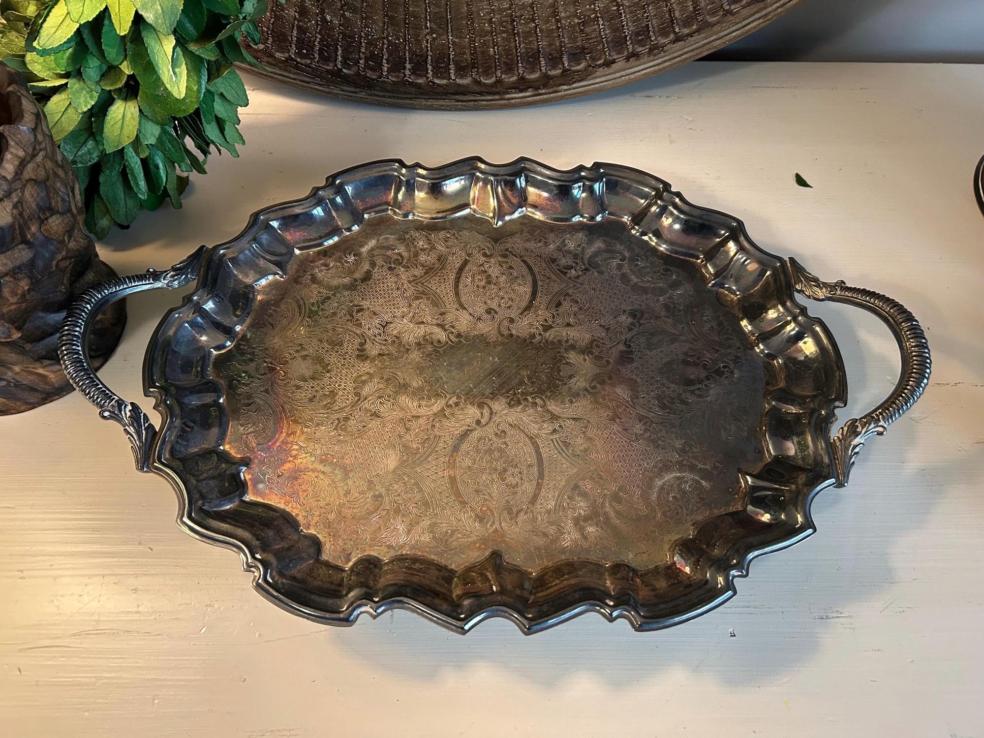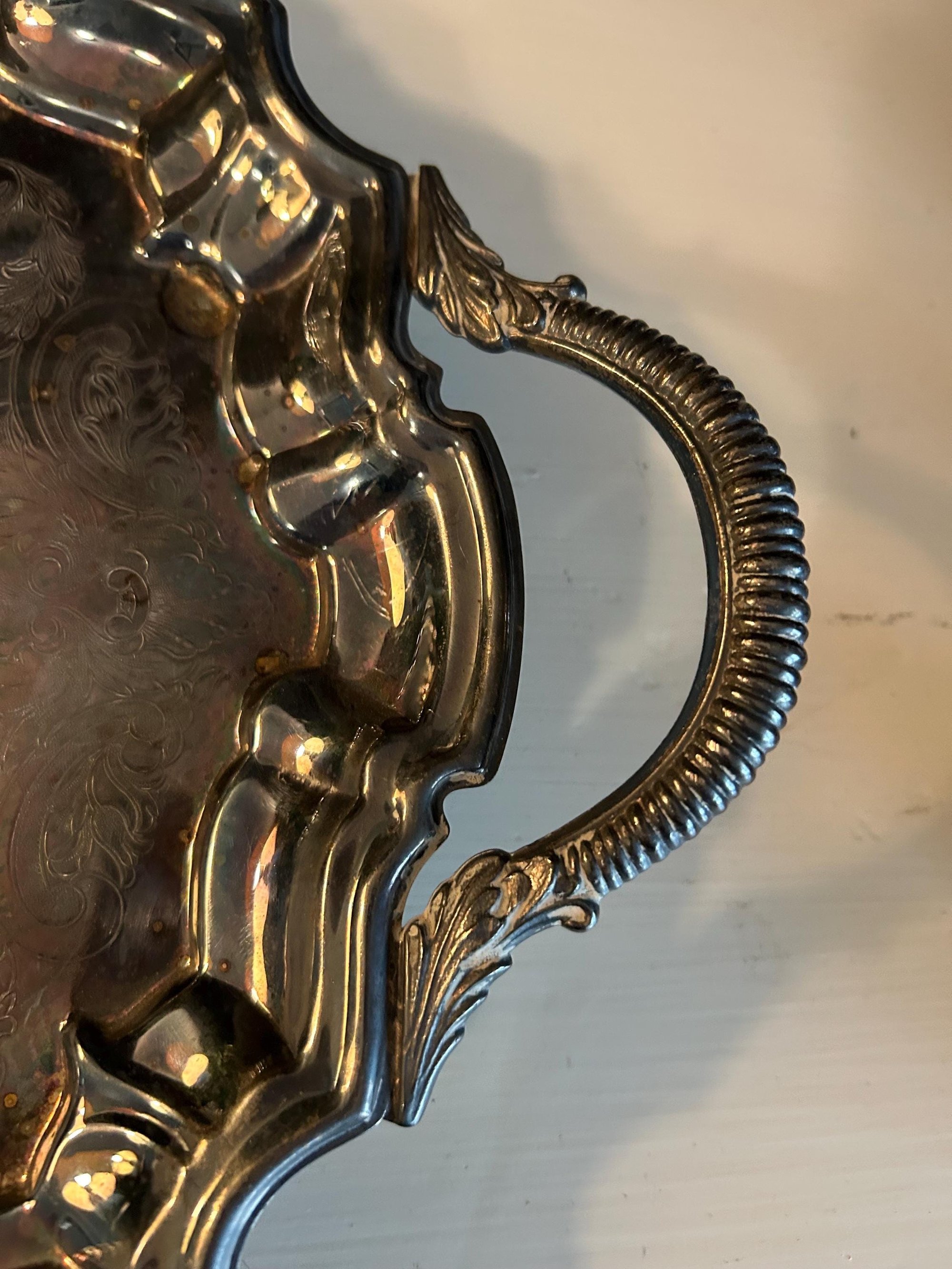 Vintage rectangular footed silver plated tray with gorgeous handles. In good vintage condition with the beginning of a nice patina, some small spots of corrosion and tarnish from use. Could be polished. The feet are ornate and have a lovely design.