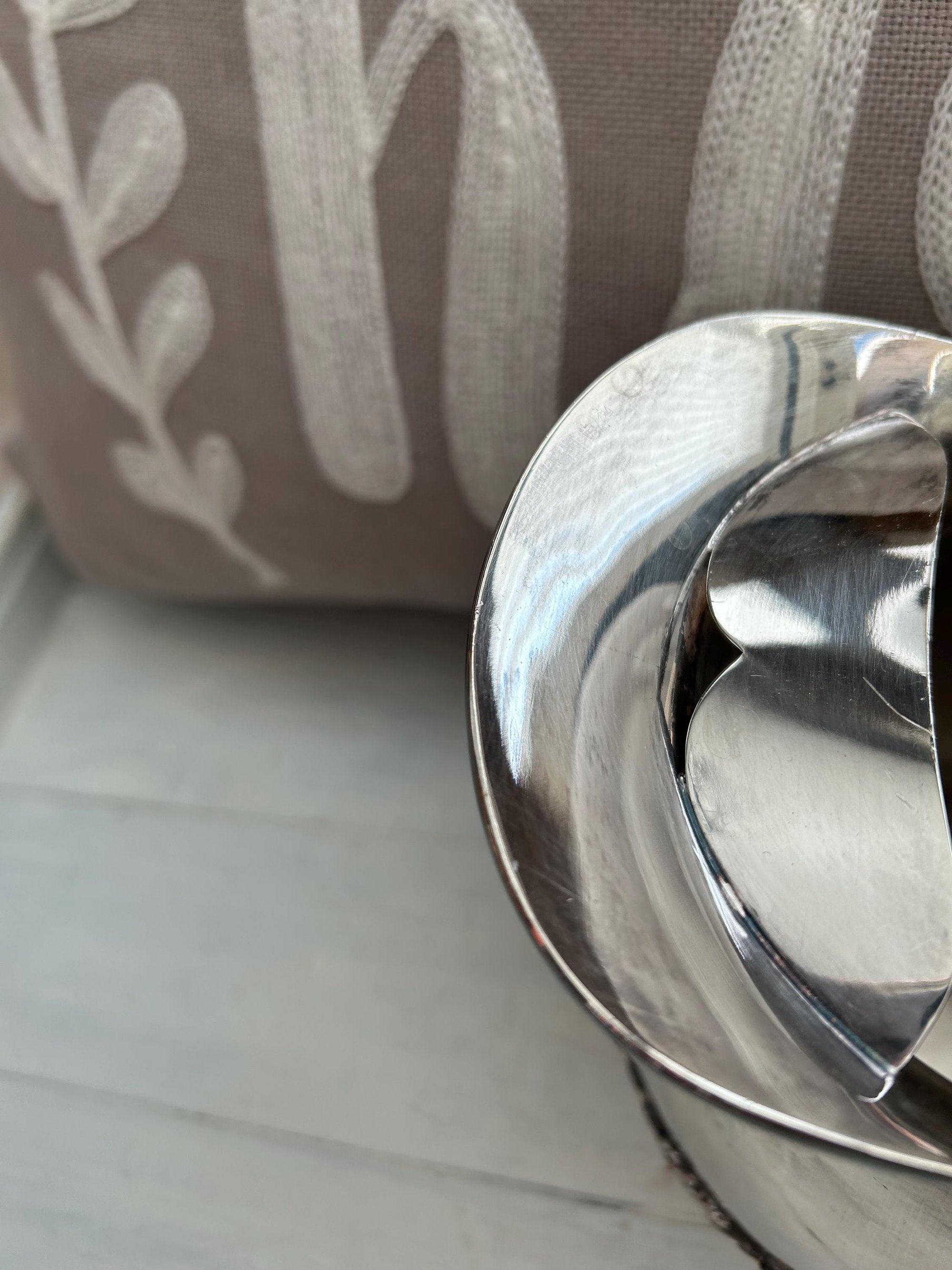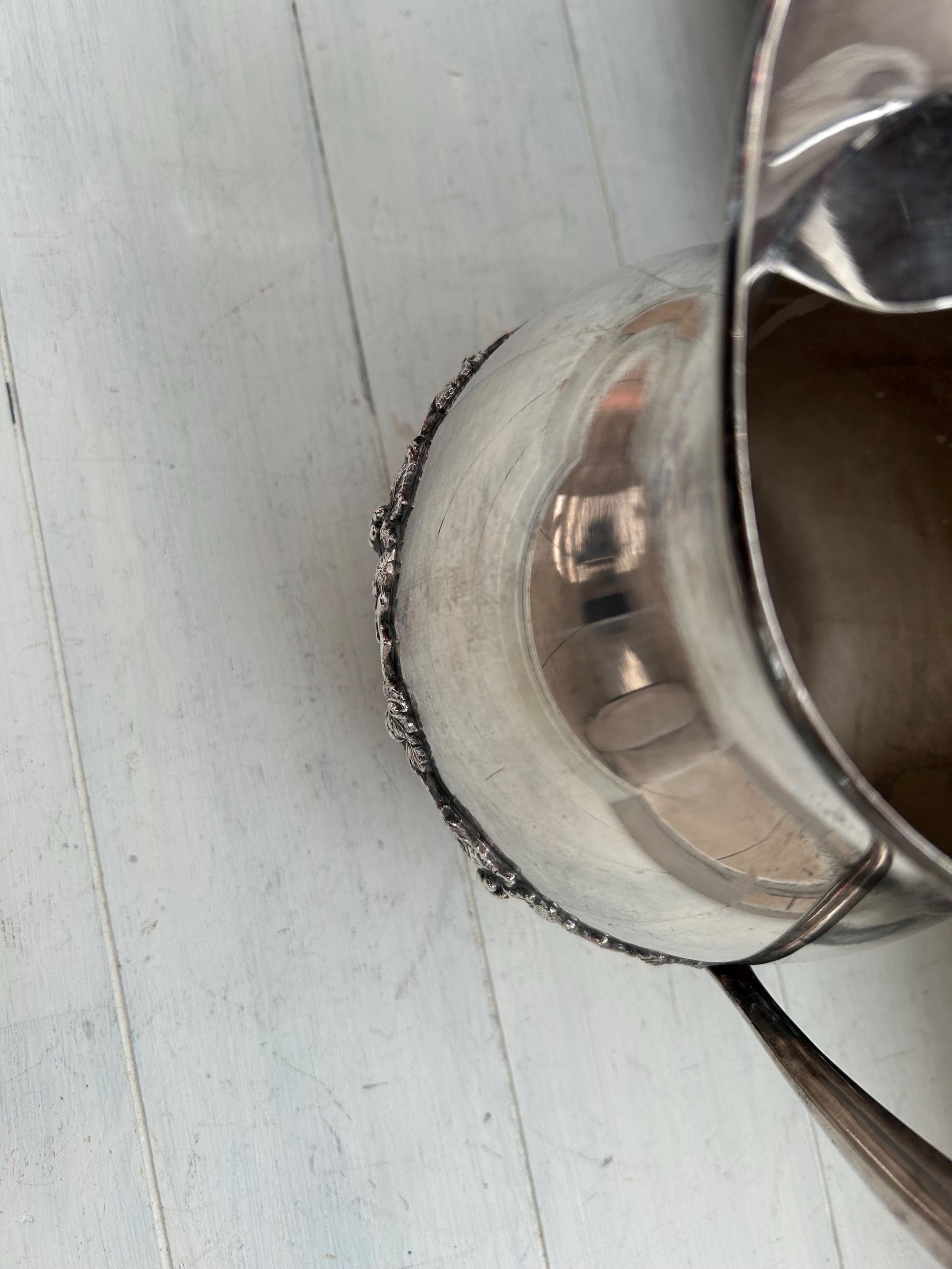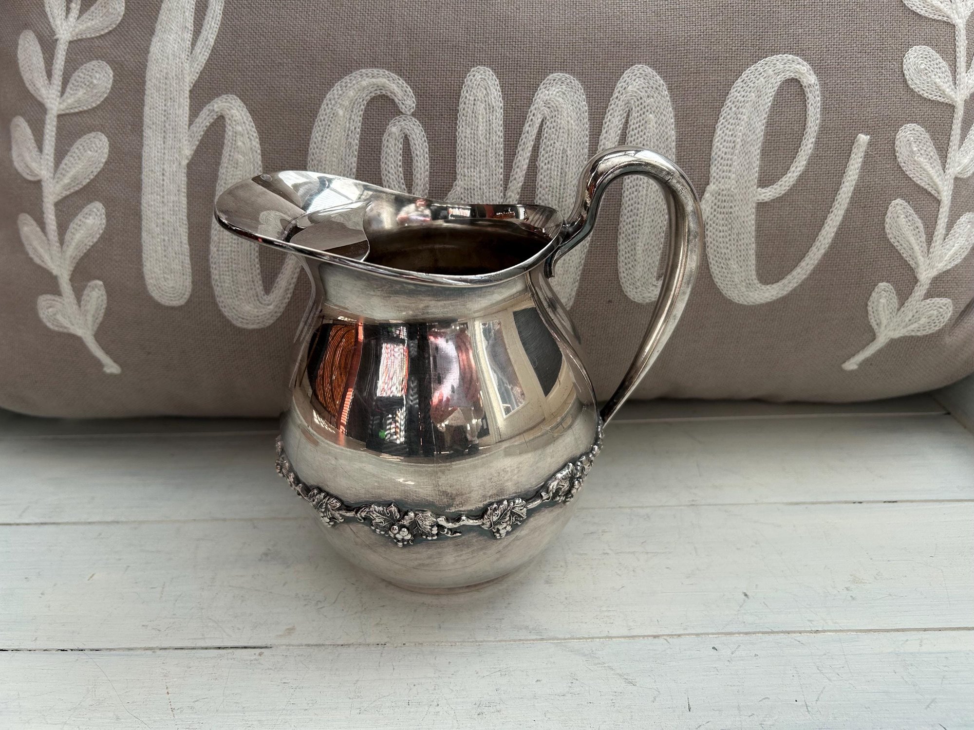 This vintage silver pitcher has some unique details in the grape and floral string across the middle. The patina that is starting is very pretty.