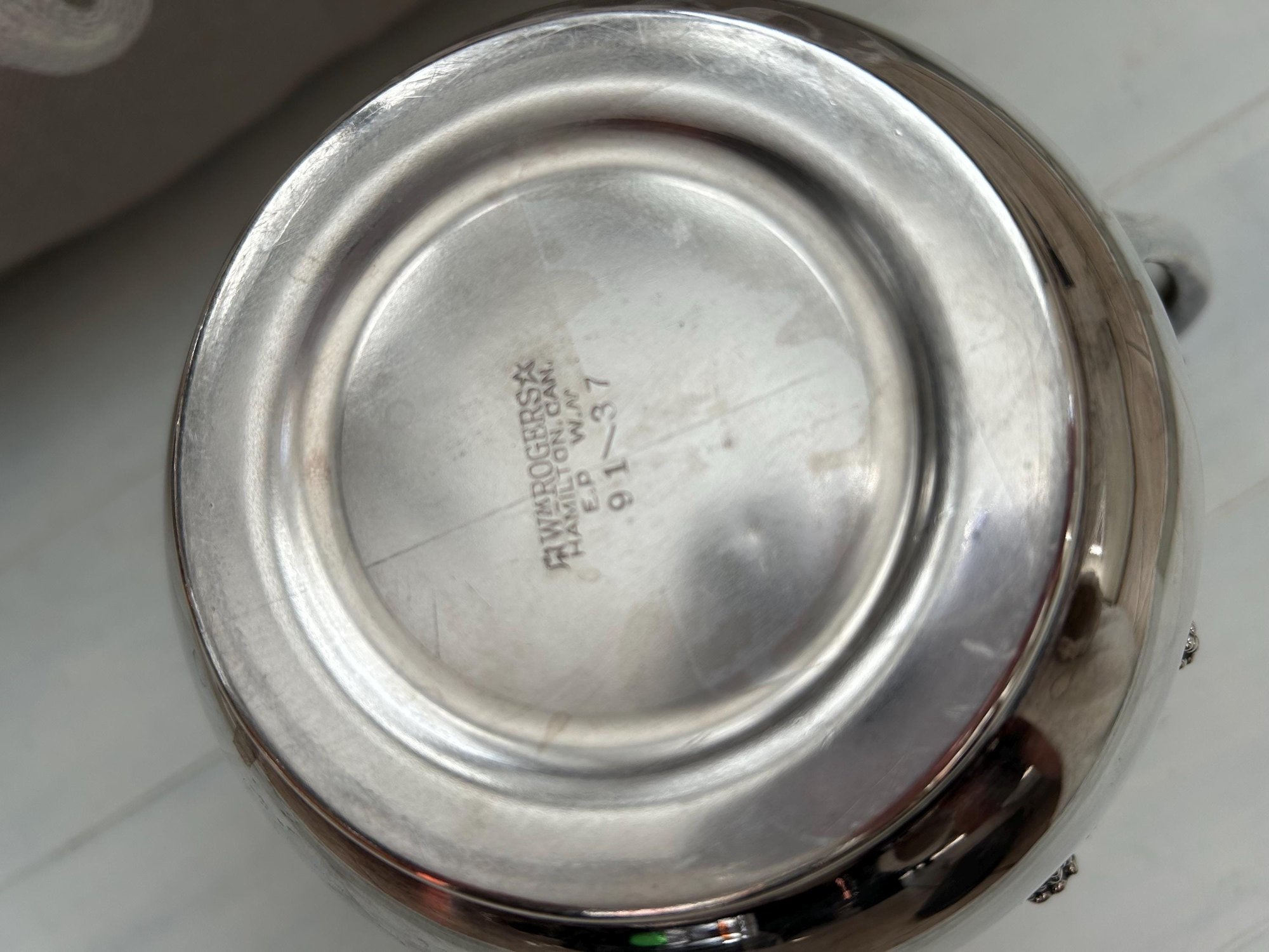 "EPWM" is stamped on the bottom; a generic mark for Electro Plated White Metal used together or inside the maker's mark. WM Rogers Made in Canada