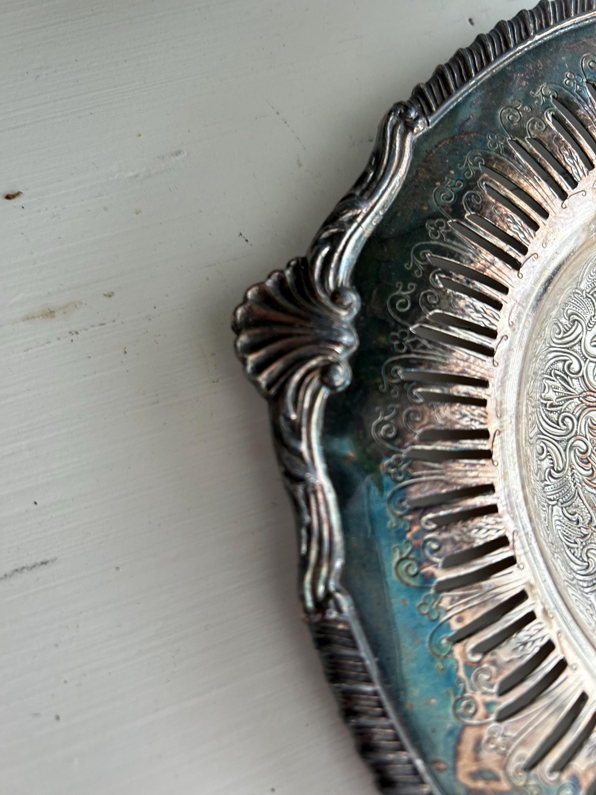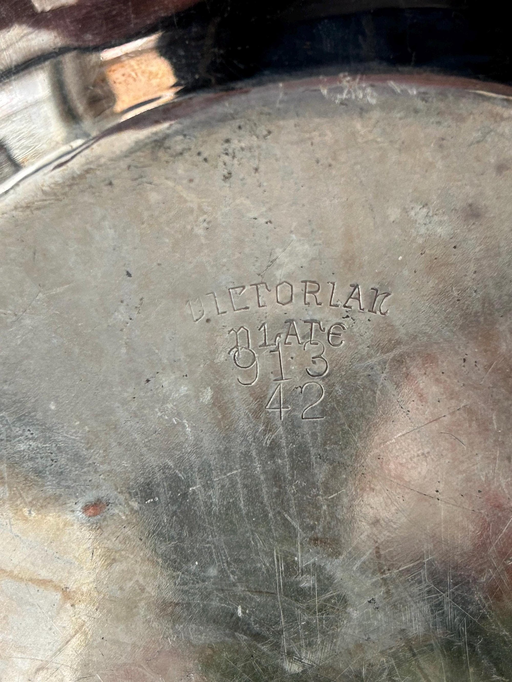 This tray has the most beautiful patina starting across its surface. Great etched design on the inside and cutouts all along the edge. This can be polished for a shiny look. The markings on the back regarding silver plate are ' Victorian Plate 913 42"