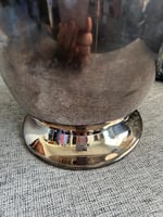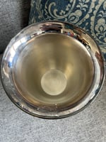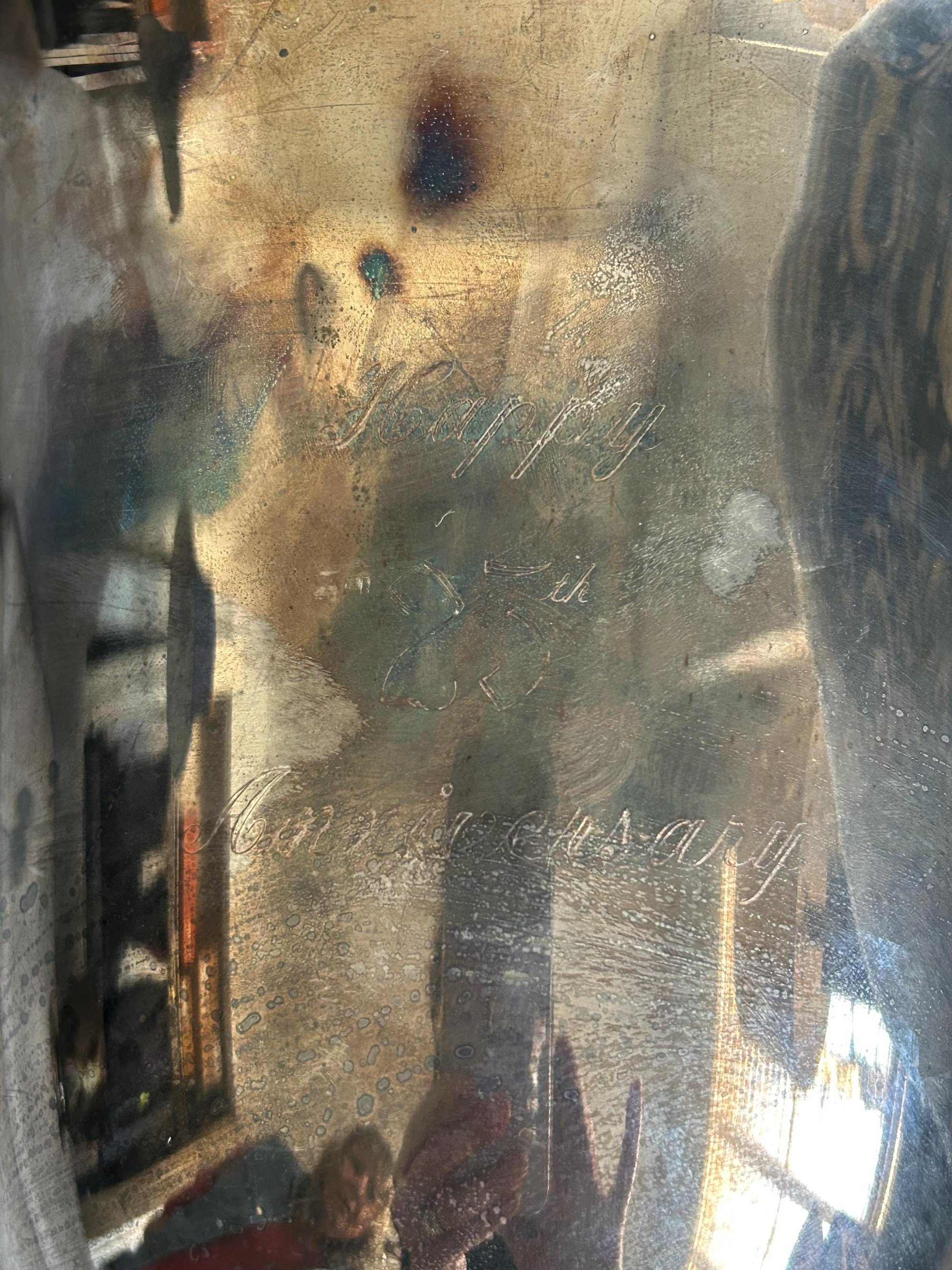 This vintage sliver urn has the beginnings of a great patina. The handles to the piece are a great detail. There is printing embossed on 1 side reading ‘Happy 25th Anniversary’ which is worn and somewhat faded. In excellent vintage condition.