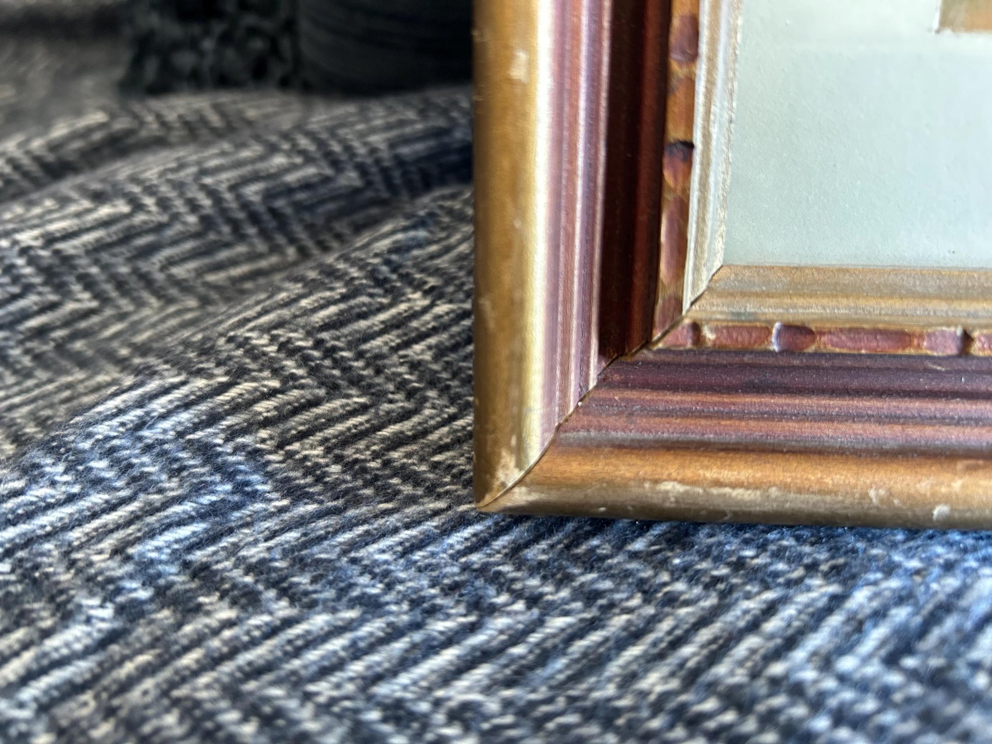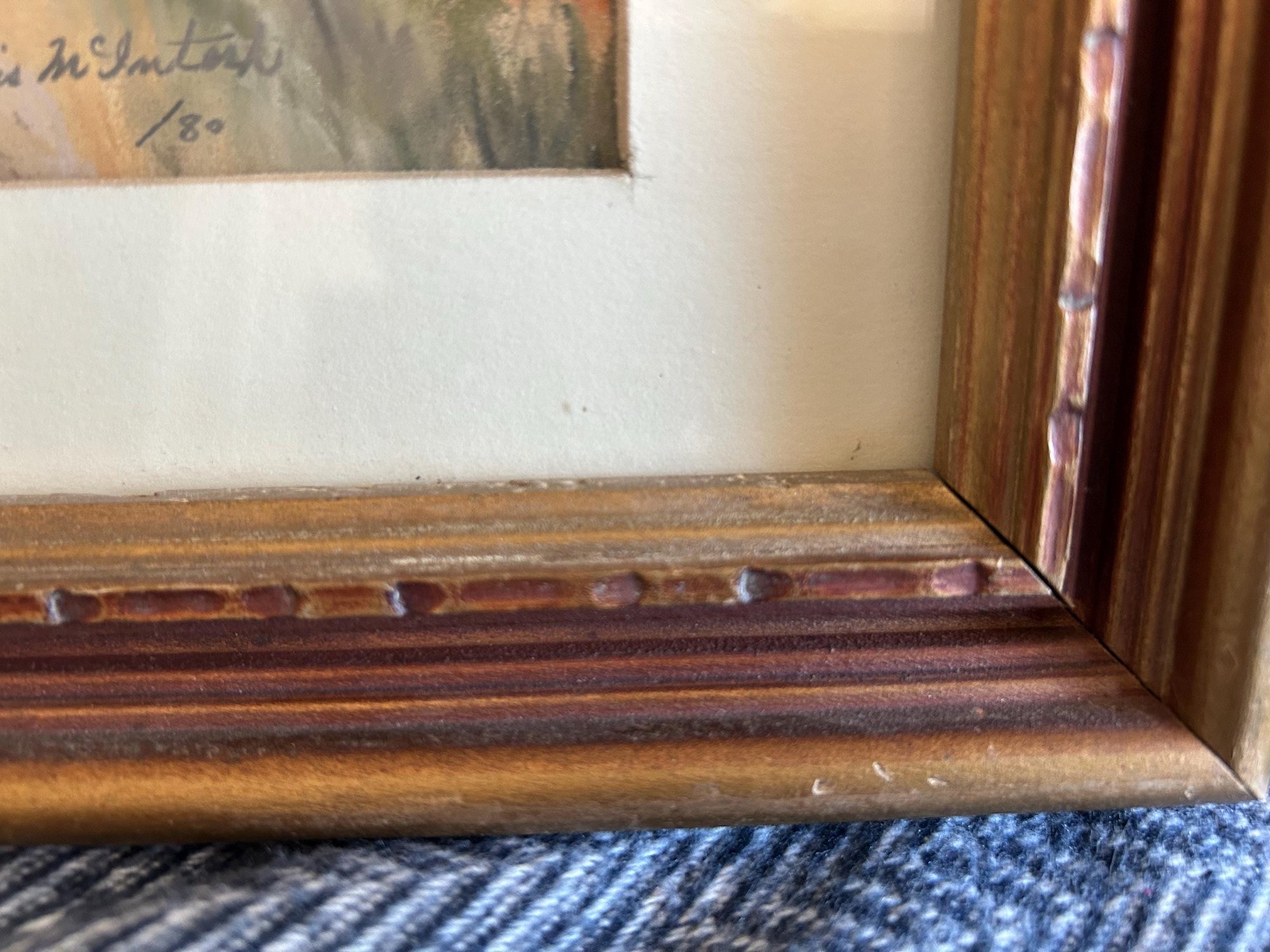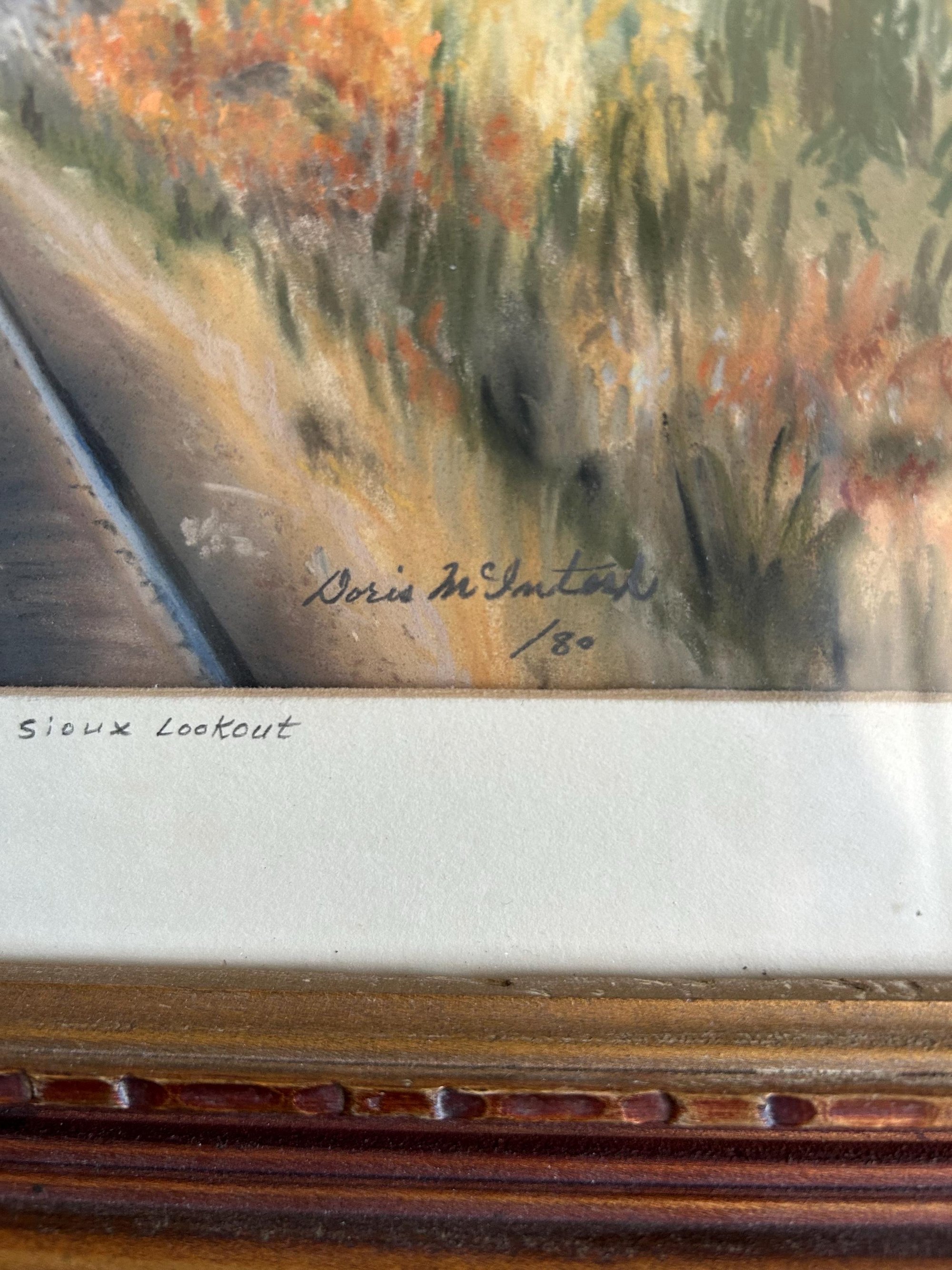 This signed framed print is in great vintage condition. This painting is by Doris McIntosh titled, "Sioux Lookout". I was not able to find anything on the artist, however, it is partially numbered which leads me to believe this is an original (see pictures) as it is numbered "/80". The frame is sturdy and the original -backing is still attached for hanging. There is a little bit of white spackle on the top of the frame. This can't be seen once hung around eye level; I can attempt to clean it upon request.