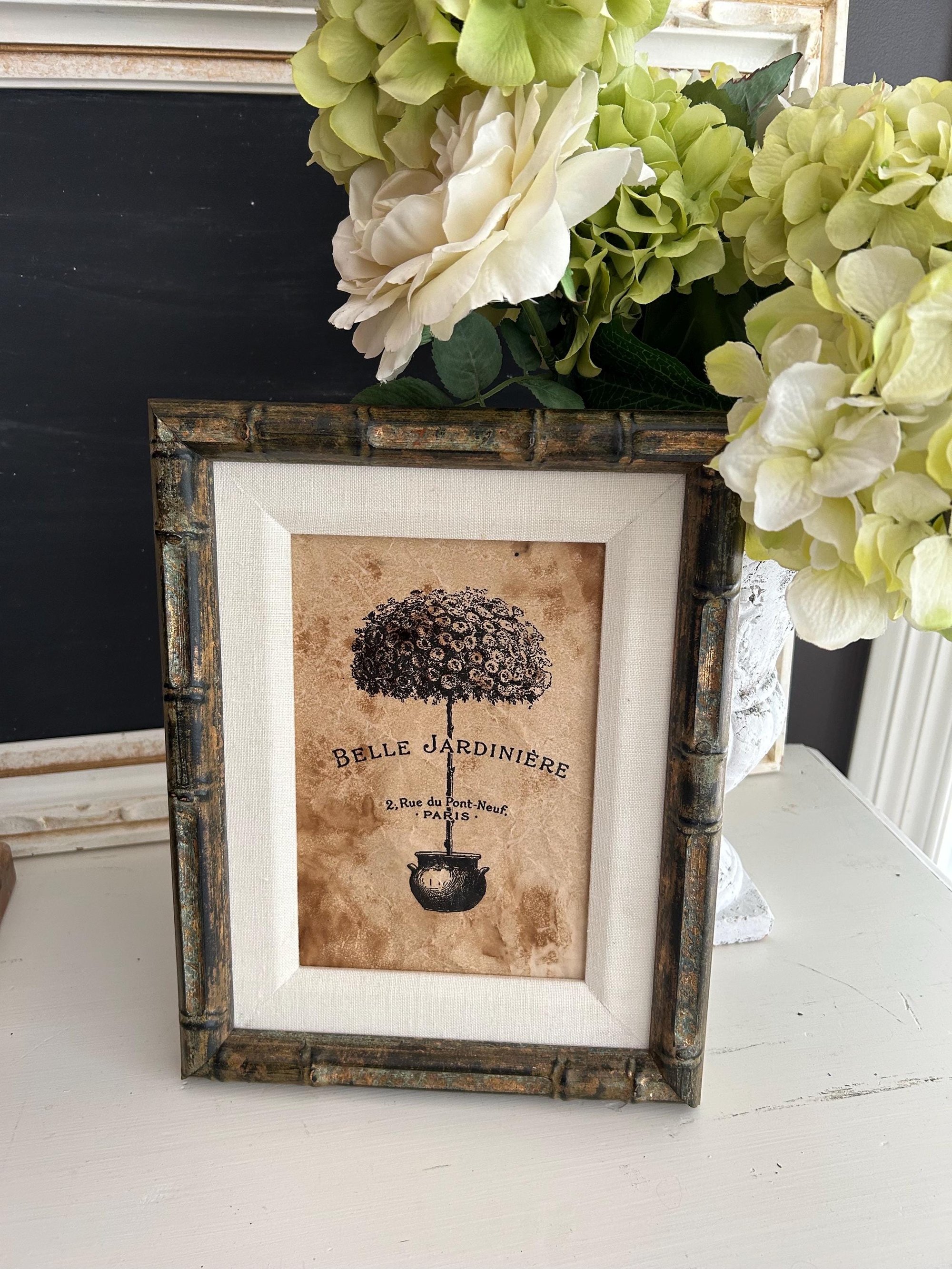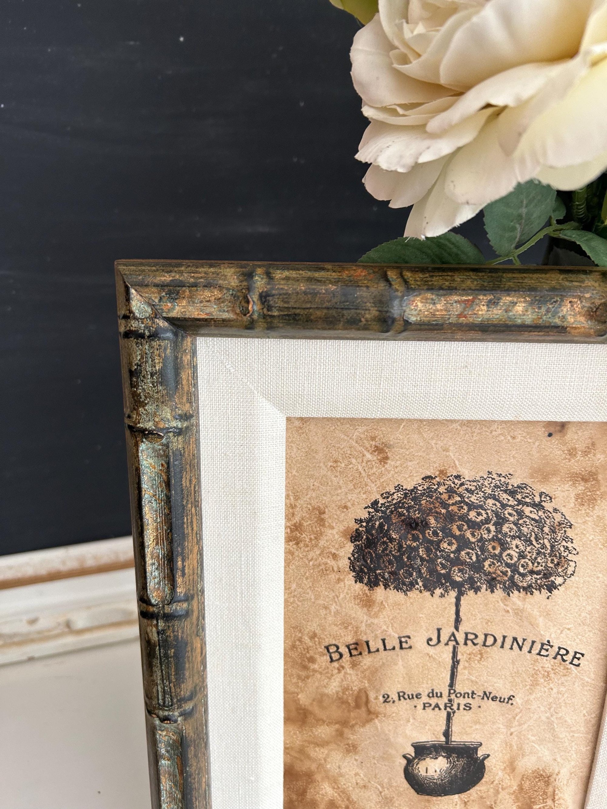 This vintage gold frame is not as old as some I have, maybe from the 90s. An updated vintage style print has been added by aging the paper of a french style print. This has been upcycled from an old mass produced picture to a unique vintage style piece of wall decor. There is no glass and as the picture has been aged it does have ripples and natural shape to the print.