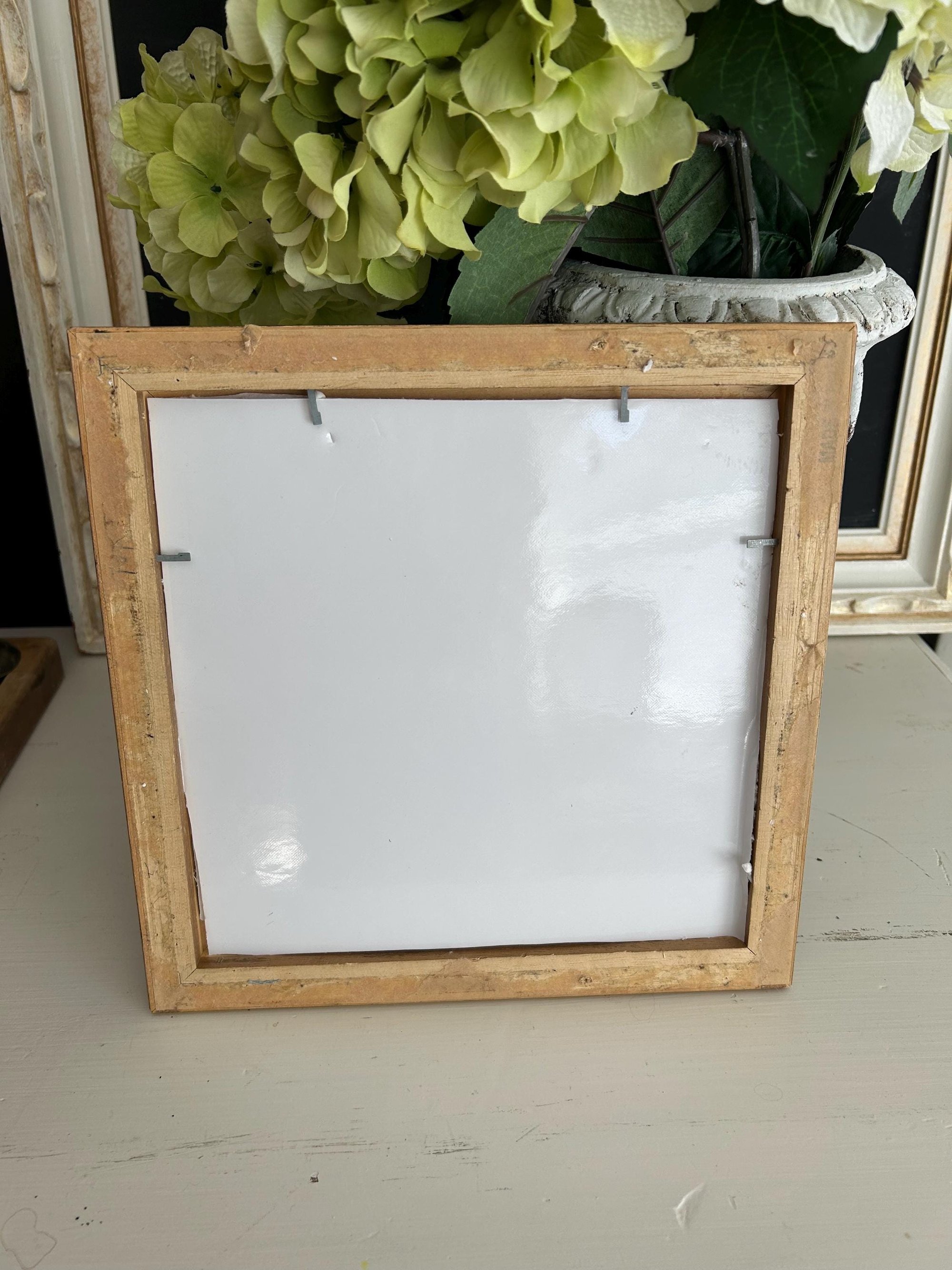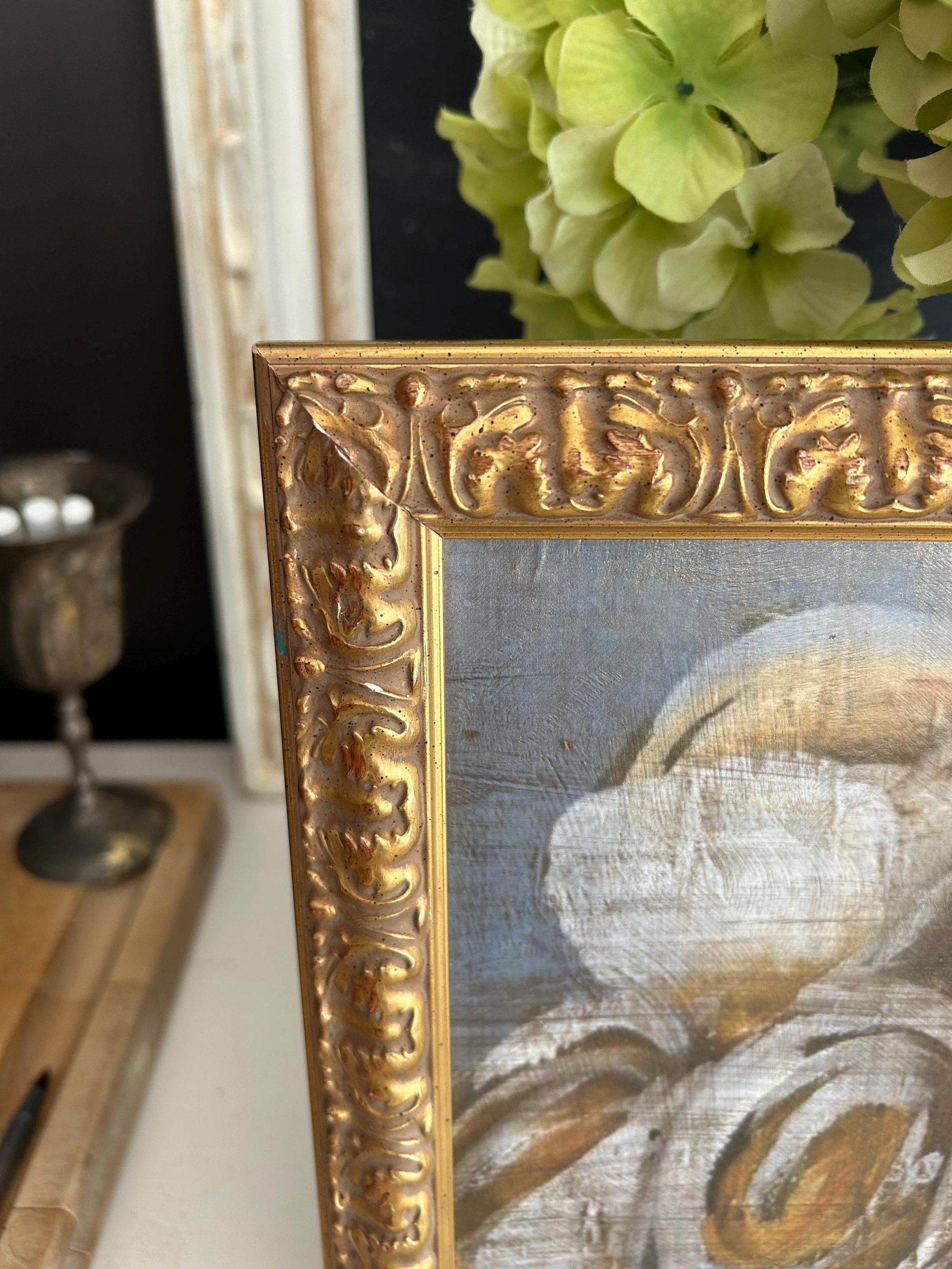 This vintage gold frame is not as old as some I have, maybe from the 90s. A vintage style print has been added and antiqued with brass wash metallic paint to highlight provide the vintage look. This has been put together for a great vintage vibe in any room. Use as it is or use the frame for your own artwork or photo.