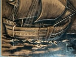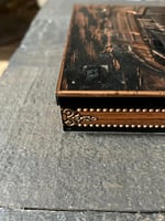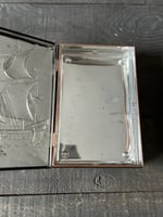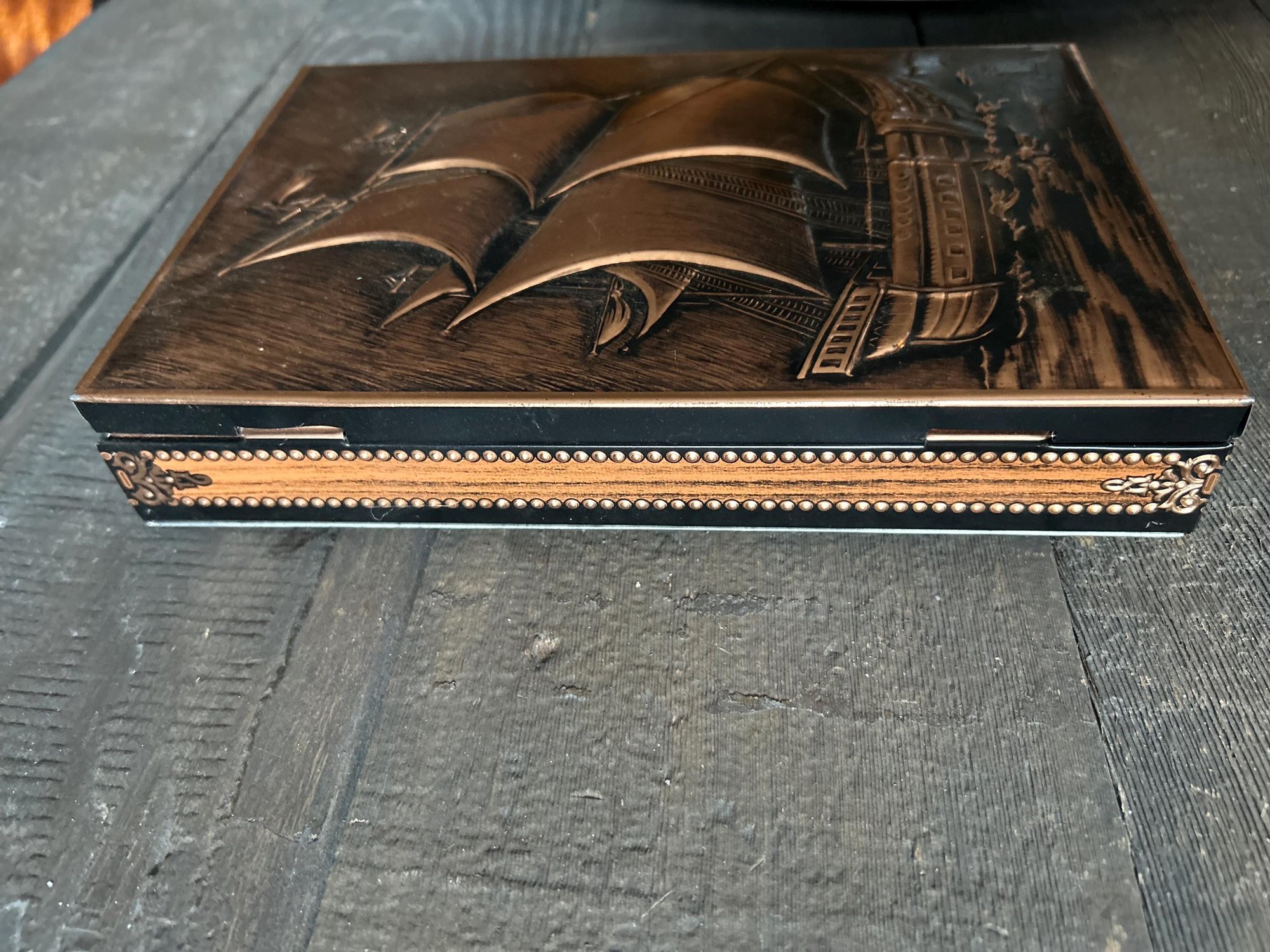 This vintage tin is in great condition. Strong and sturdy, no major dents or breaks in the metal that I can see (1 very small dent above 1 hinge but does not affect the opening or closing). It is embossed with a tall ship on the lid. Please refer to the attached photos. The lid opens and closes with no issues. The colouring is in great shape, strong copper and black. Normal wear and tear for its age.