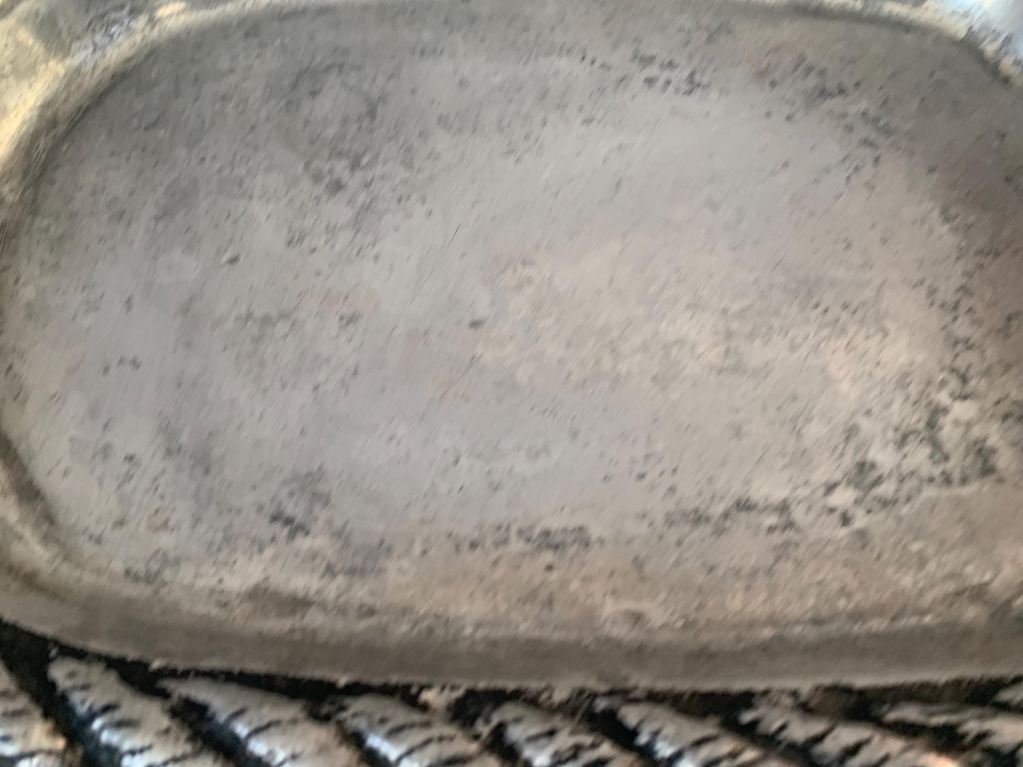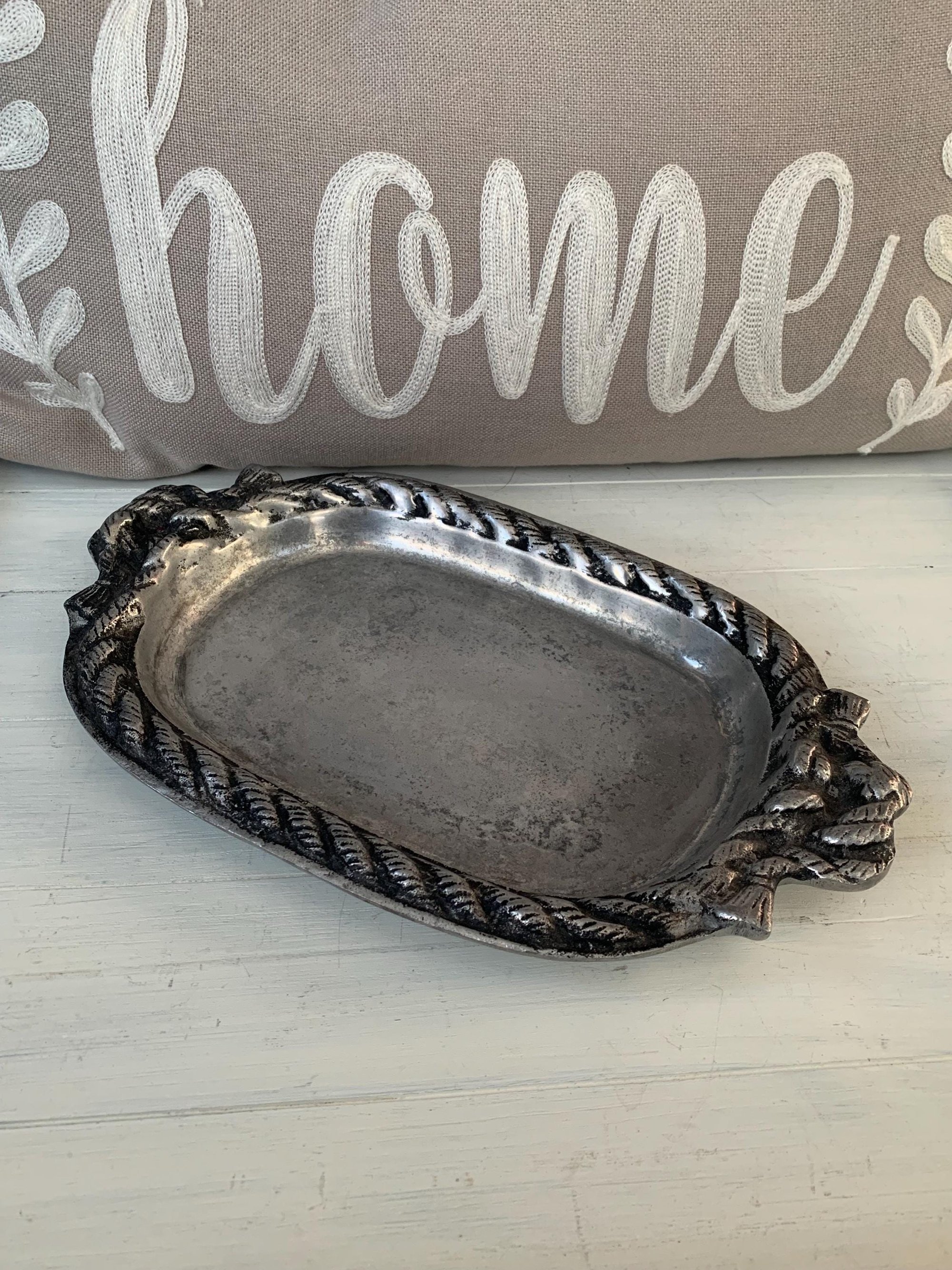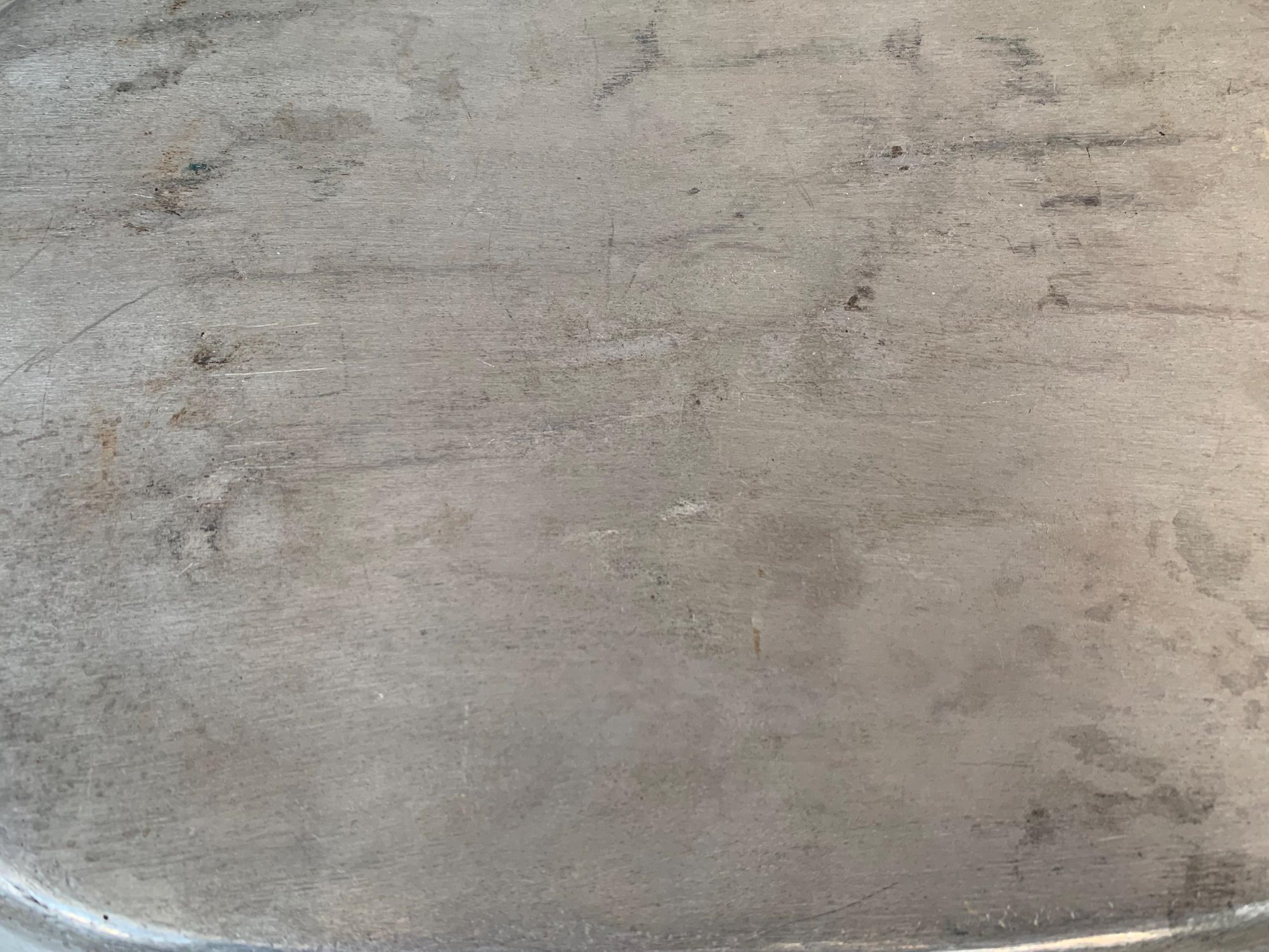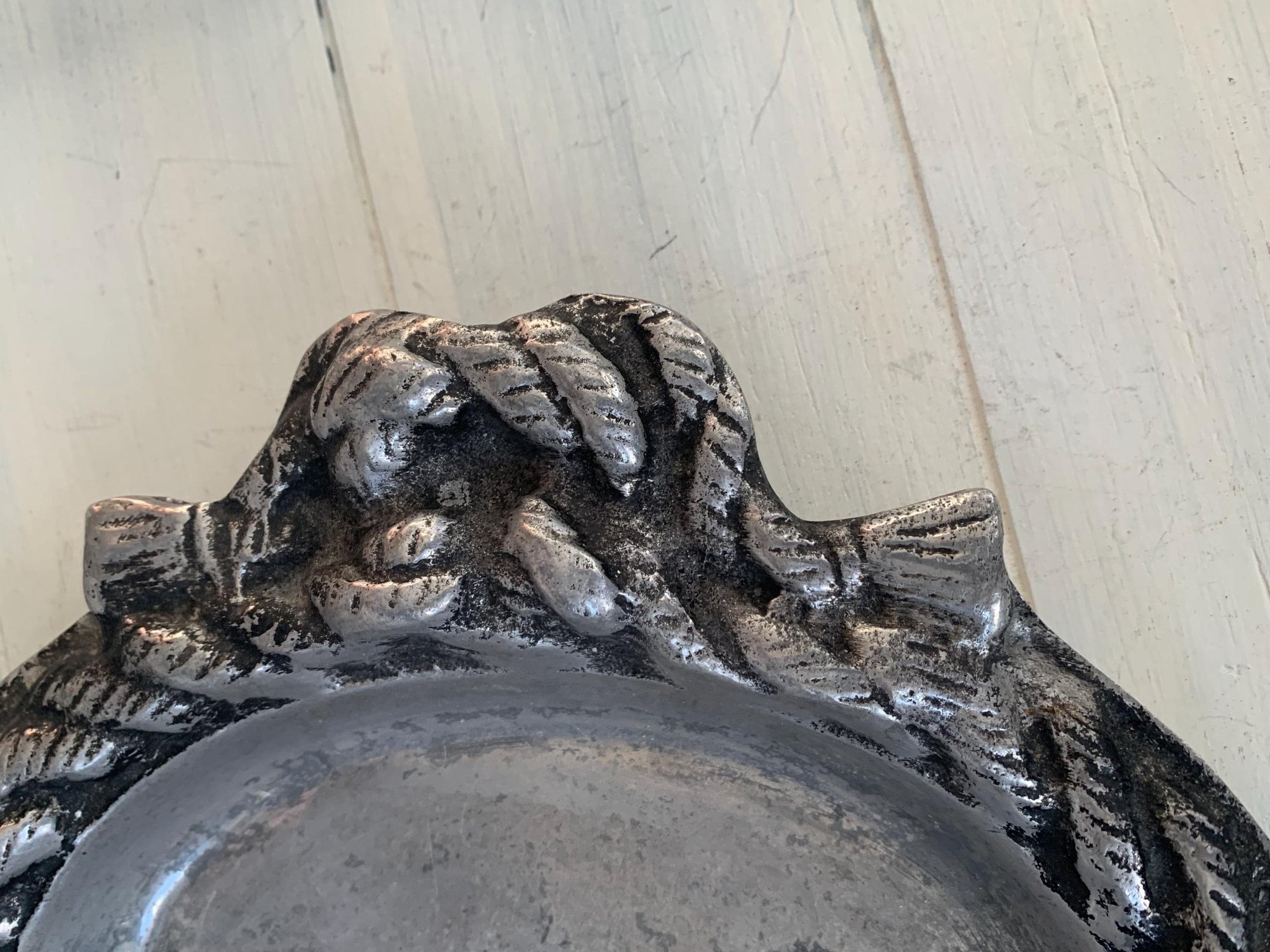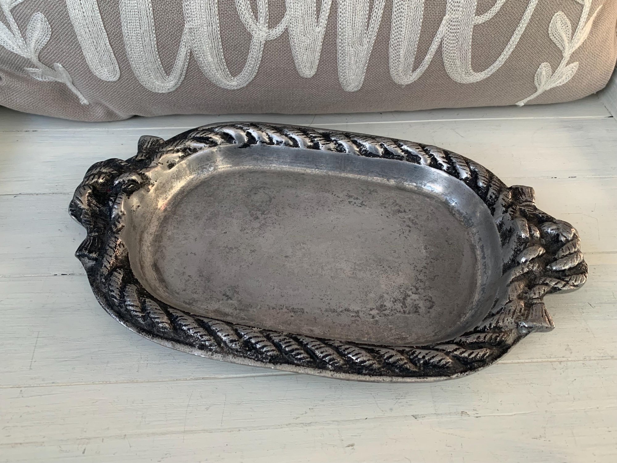 This tray is in excellent vintage condition, the metal is in great shape with an original attempt to show a aged look. The scroll work appears to have no cracks or chips in it. This is not as old as some trays I have had but the styling and condition make it a great addition to a decor setting. Stands sturdy on a tabletop.