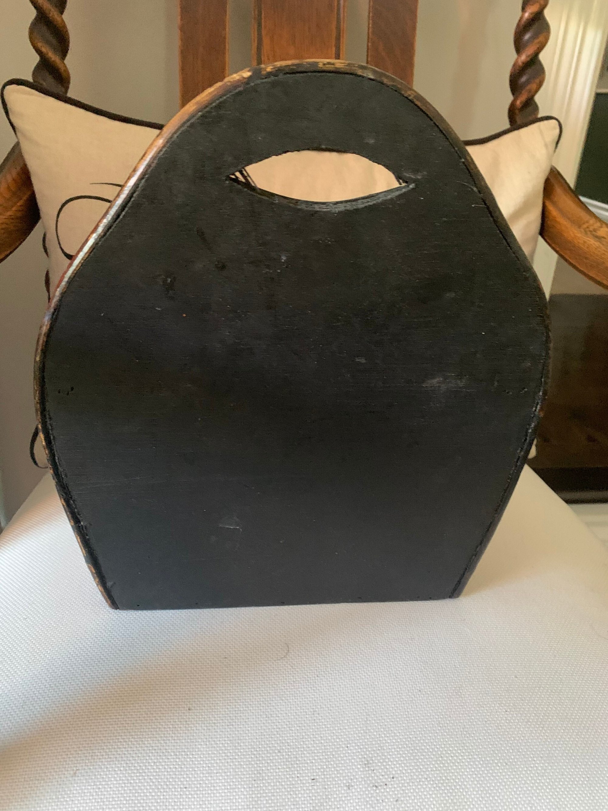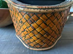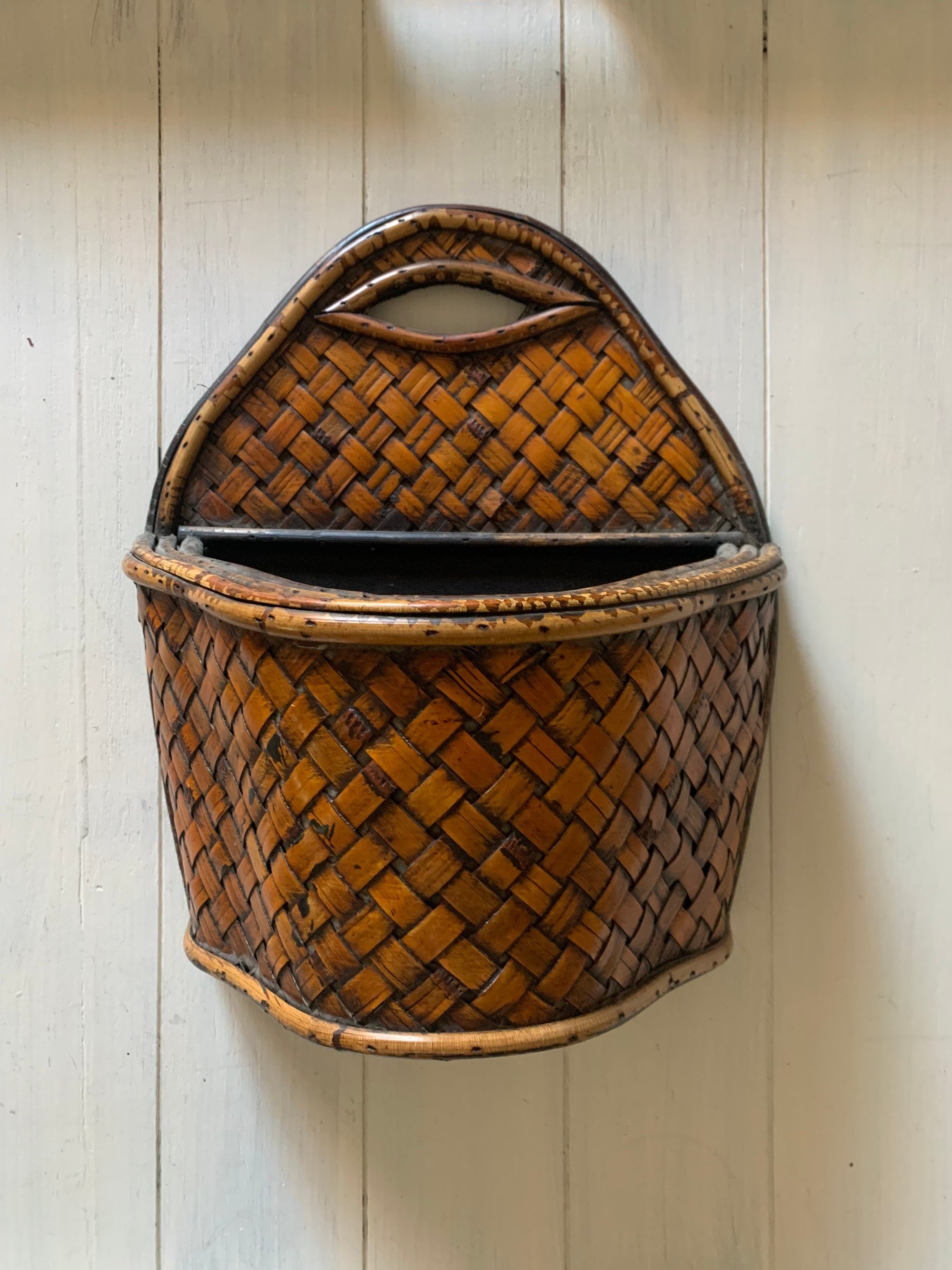 The colour on this vintage basket is beautiful. Its warm tone and worn areas give it a gorgeous patina and look. Very sturdy. Can be hung on a wall with the handle of sat tabletop.