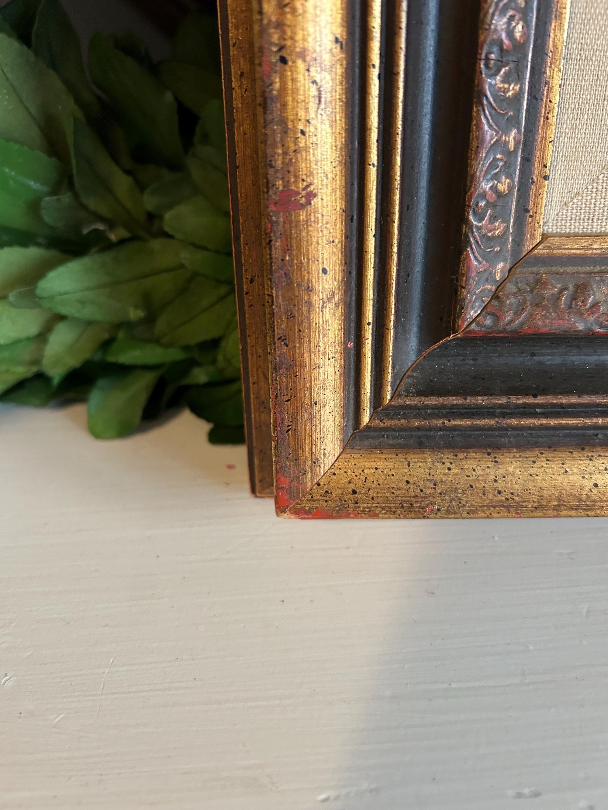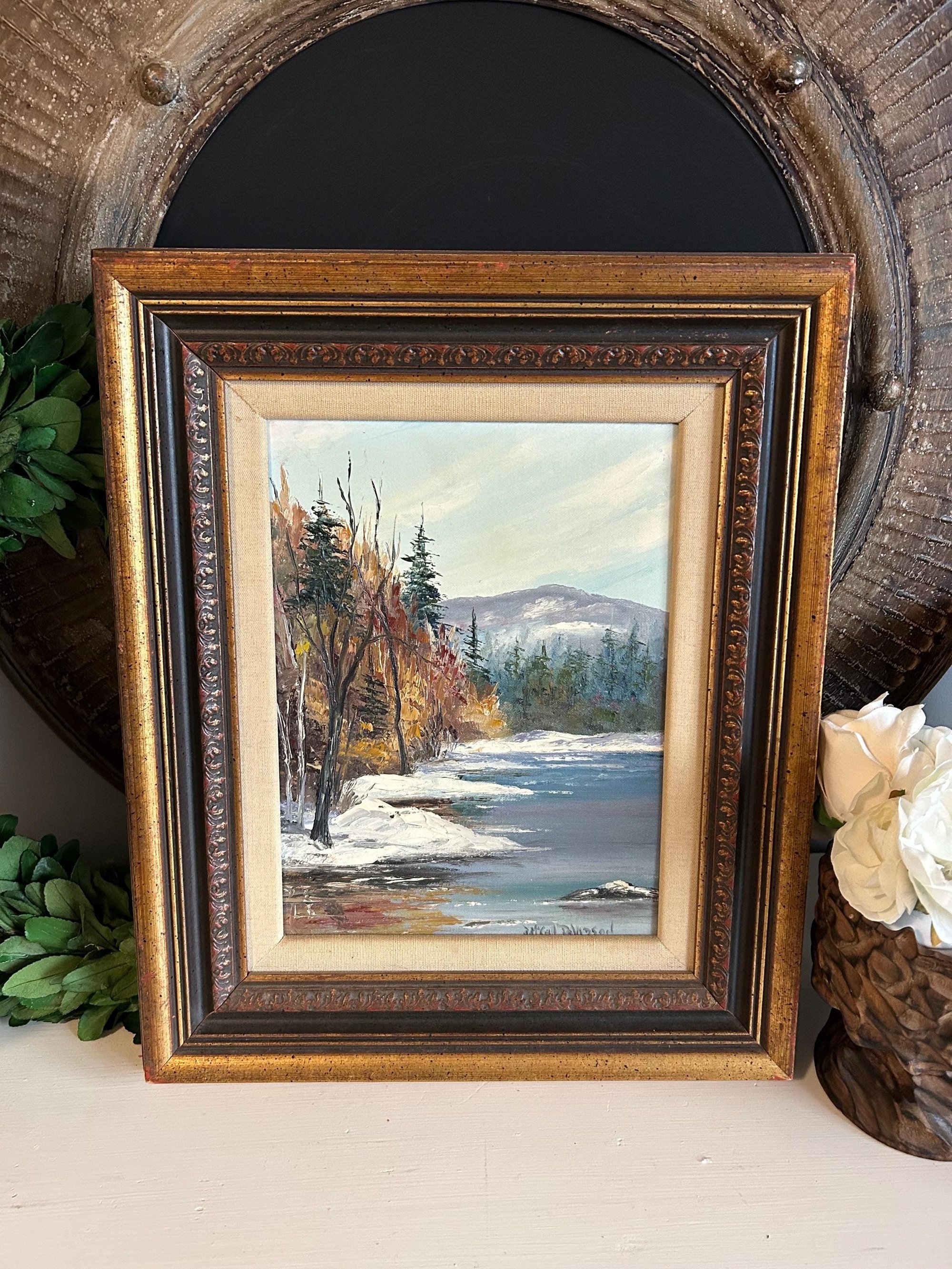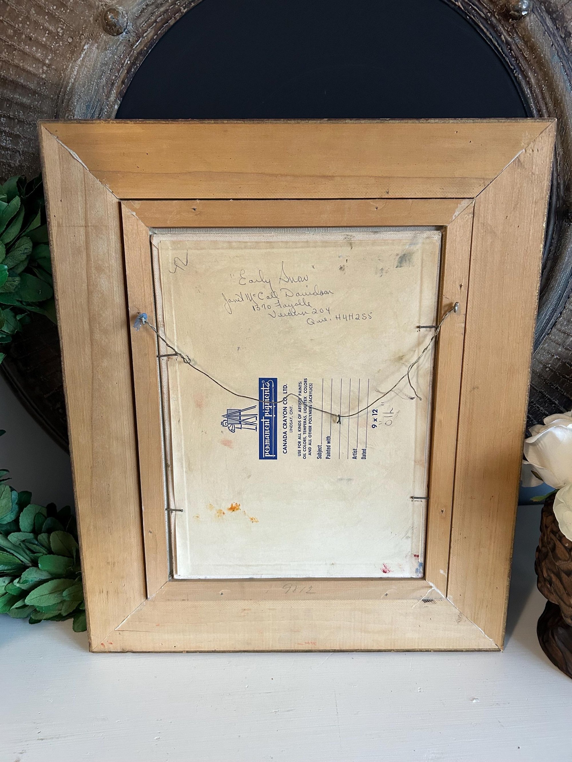 This vintage original, signed frame and painting are in excellent condition. There is 1 small area on the top left corner of the frame which shows some damage (pic# 10) The signature is hard to make out on front but is repeated on the back. It appears to be an amateur Canadian painter. It is very sturdy. The colouring on the painting is still strong, no fading. The frame is wood.