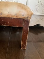 This vintage stool is in good solid condition. This wooden vintage foot stool has older fabric on the top showing Robin Hood Flour, the fabric is nailed on as was done in vintage years, it appears to have been there for quite some time. There is staining on the fabric due to its age. The legs show wear and chipping for its age as shown in pictures.