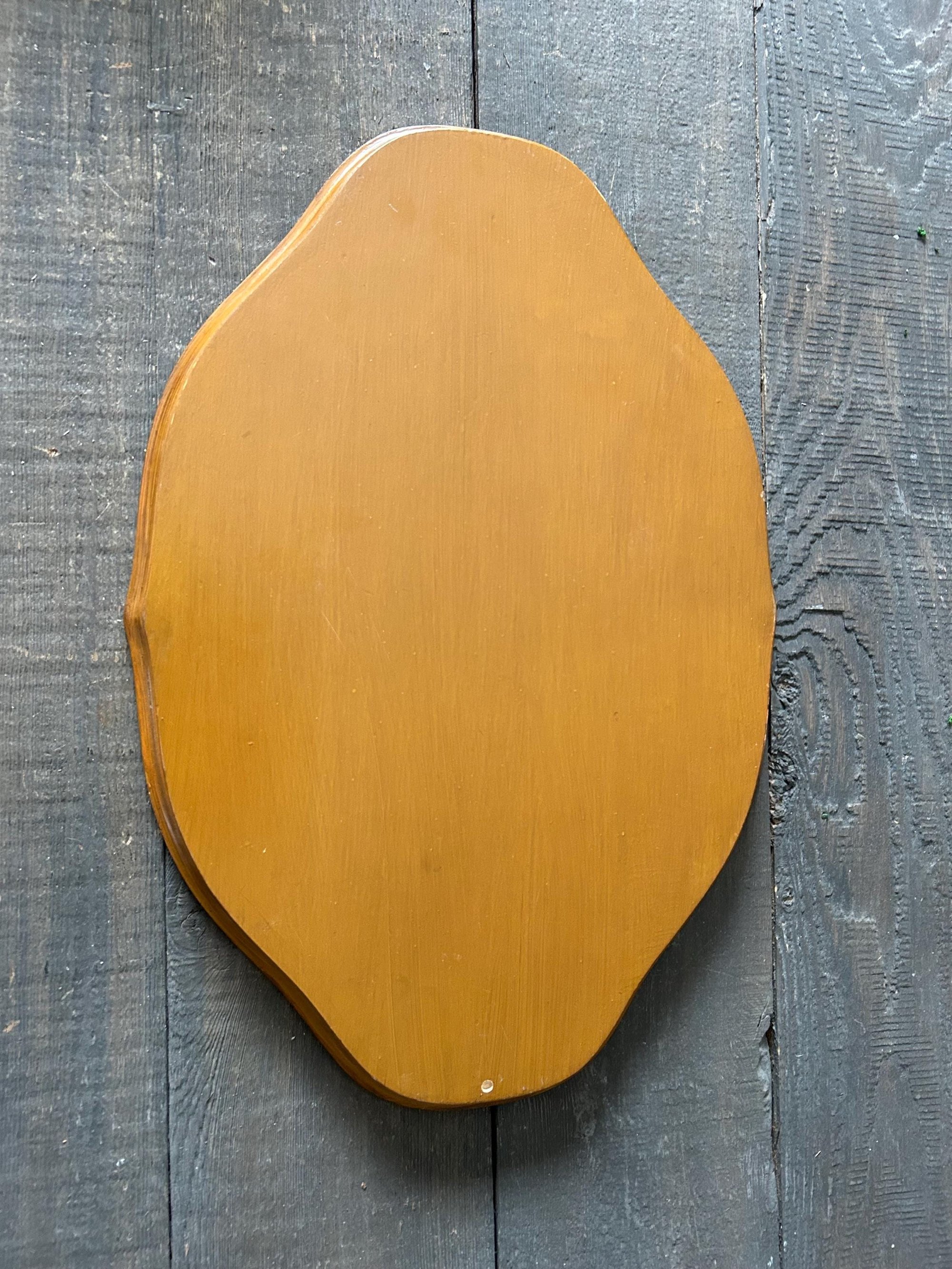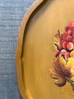 This Vintage wood serving or drink tray is in great shape. It has a hole in the back for hanging on a wall as decor as well. It is very sturdy. No chips or cracks that I can see, there are a few scratches as pictures show otherwise in great shape overall.