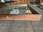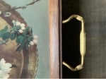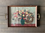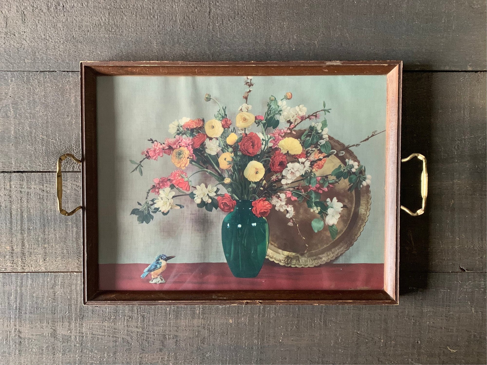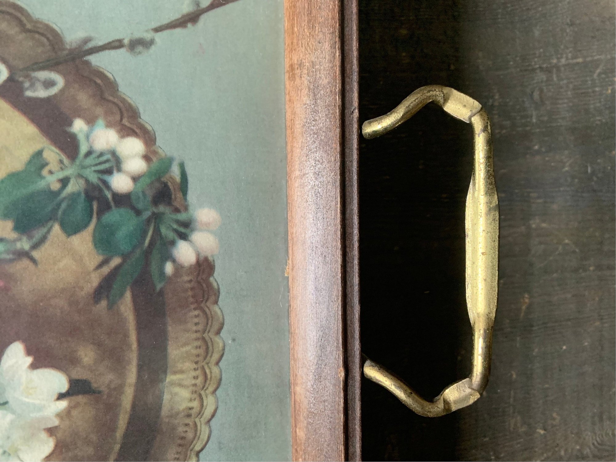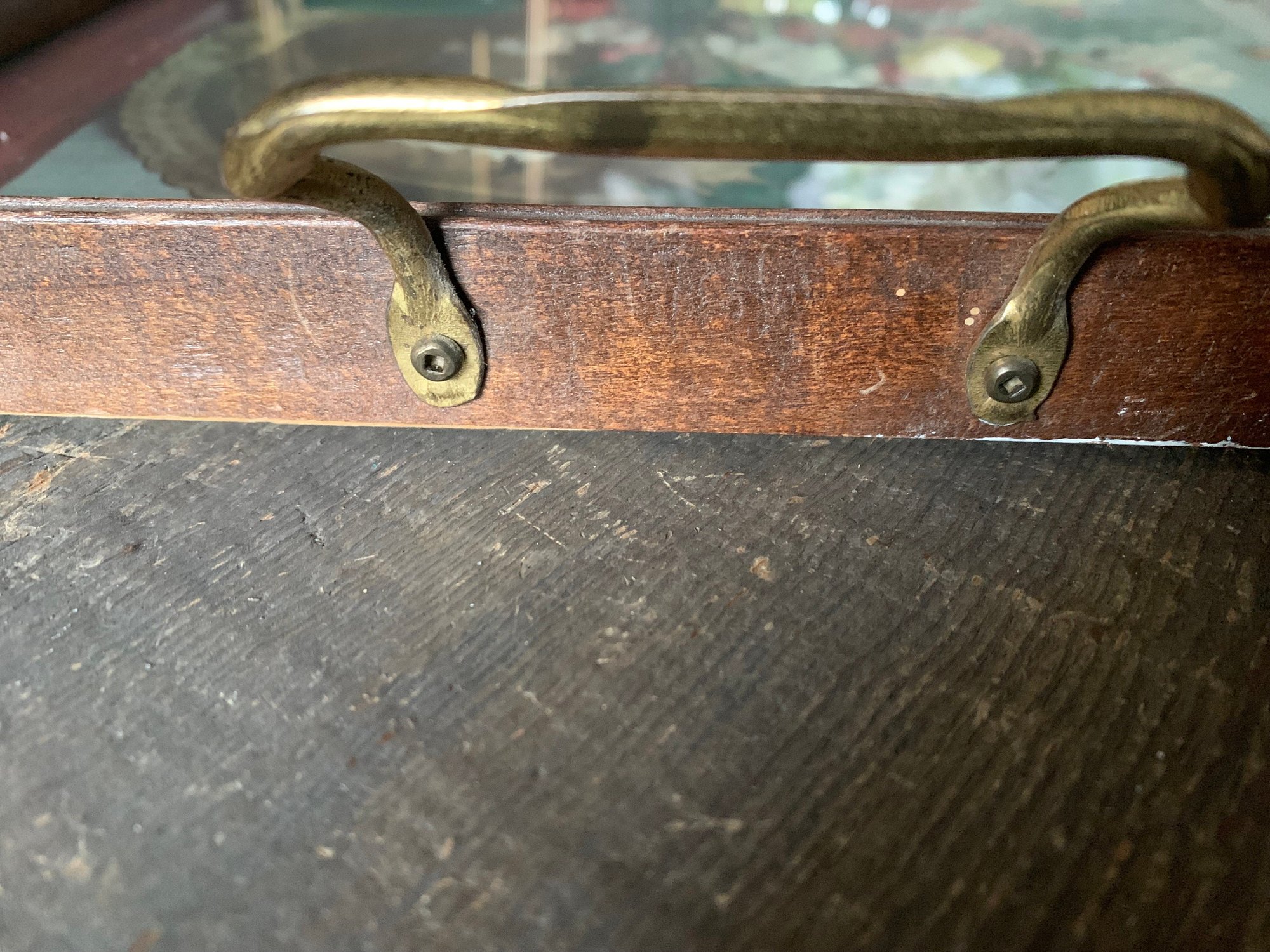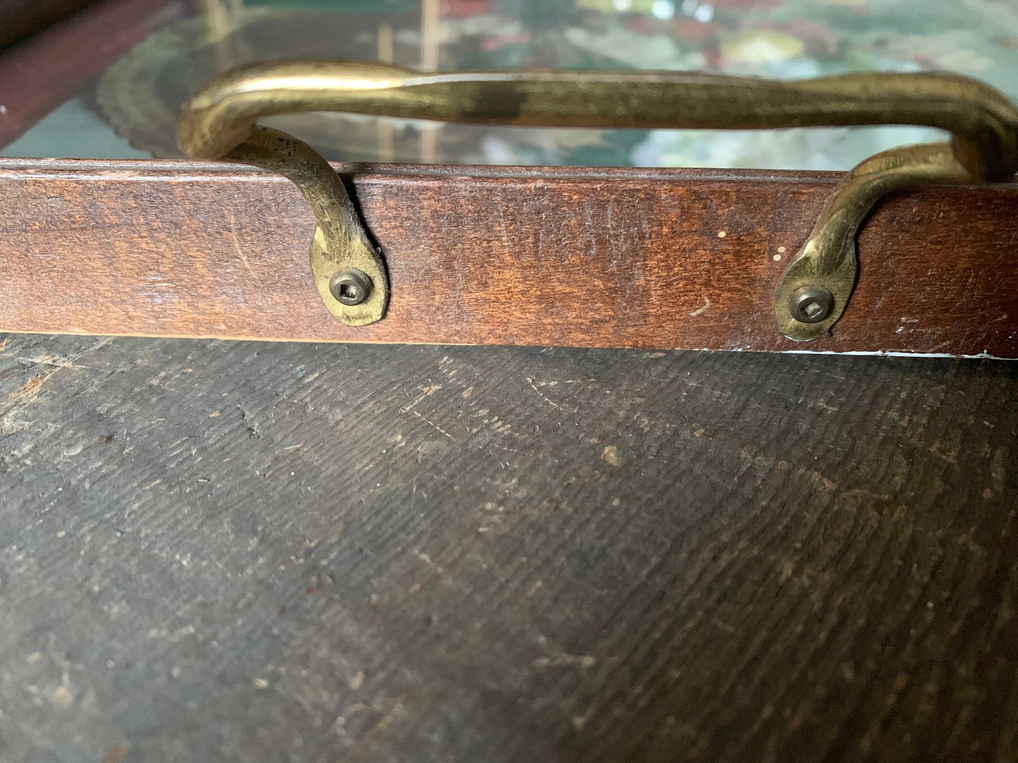 Vintage wood serving or drink tray with lovely handles. The tray feels very sturdy and stands firm without wobbles on any surface. There is glass on top of the paper picture which does have some rippling in it (as shown in pictures). This is due to age. The handles are made of brass. There is wear on the wood edges as shown in the pictures.