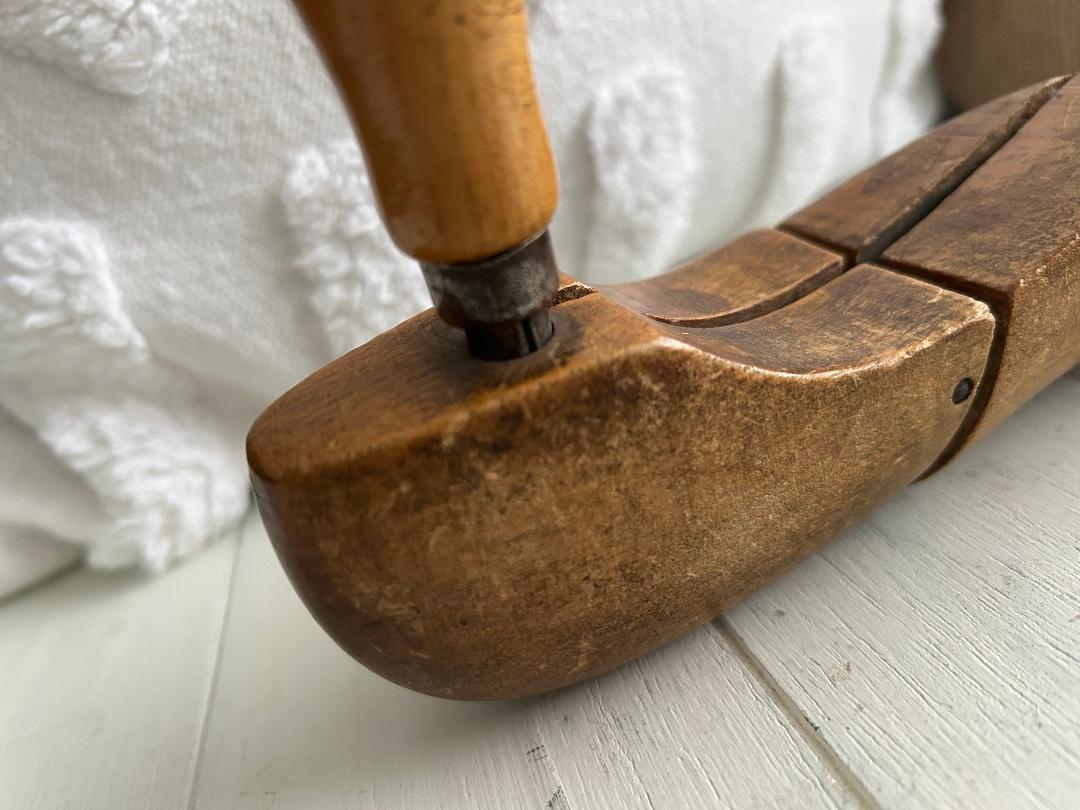 The colouring on the wood of this of shoe stretcher is quite unique and striking. Many areas of wear as shown in pictures. Beautiful patina on the wood. Hinges still work great. Not sure of the shoe size. Great piece to use as vintage decotr
